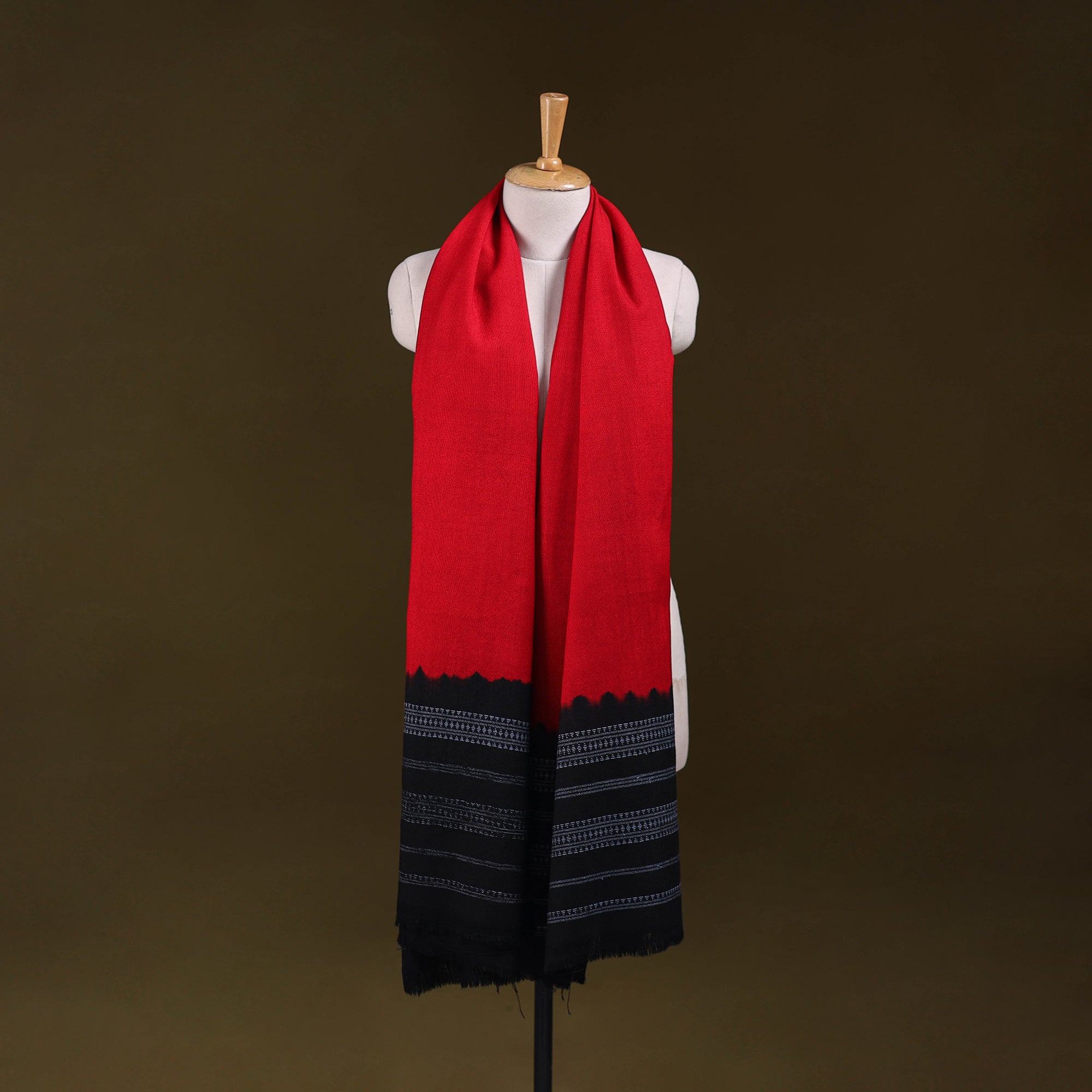 Red handwoven merino wool shawl showcasing the artistry of Kutch Gujarat. Crafted by skilled artisan Vankar Bhimji Kanji it blends traditional charm with a contemporary touch. It adds grace to both everyday outfits and festive looks while offering comforting warmth making it a beautiful choice for chilly days.