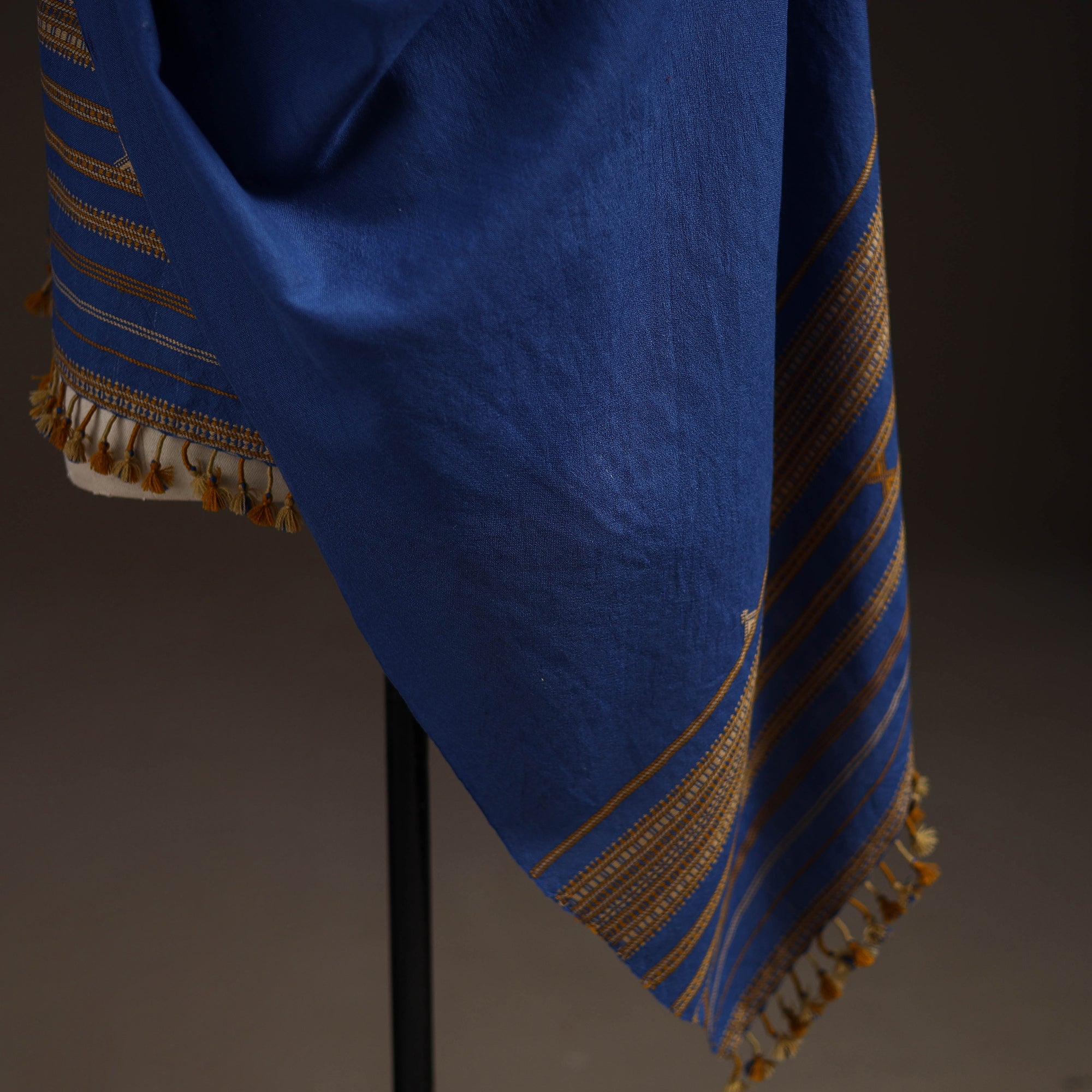 Handwoven shawl by Vinay Siju in Bhuj, Gujarat. Designed with traditional Kutchi motifs and tassels. Made from merino wool to provide reliable warmth. A practical choice for everyday winter wear or outings.
