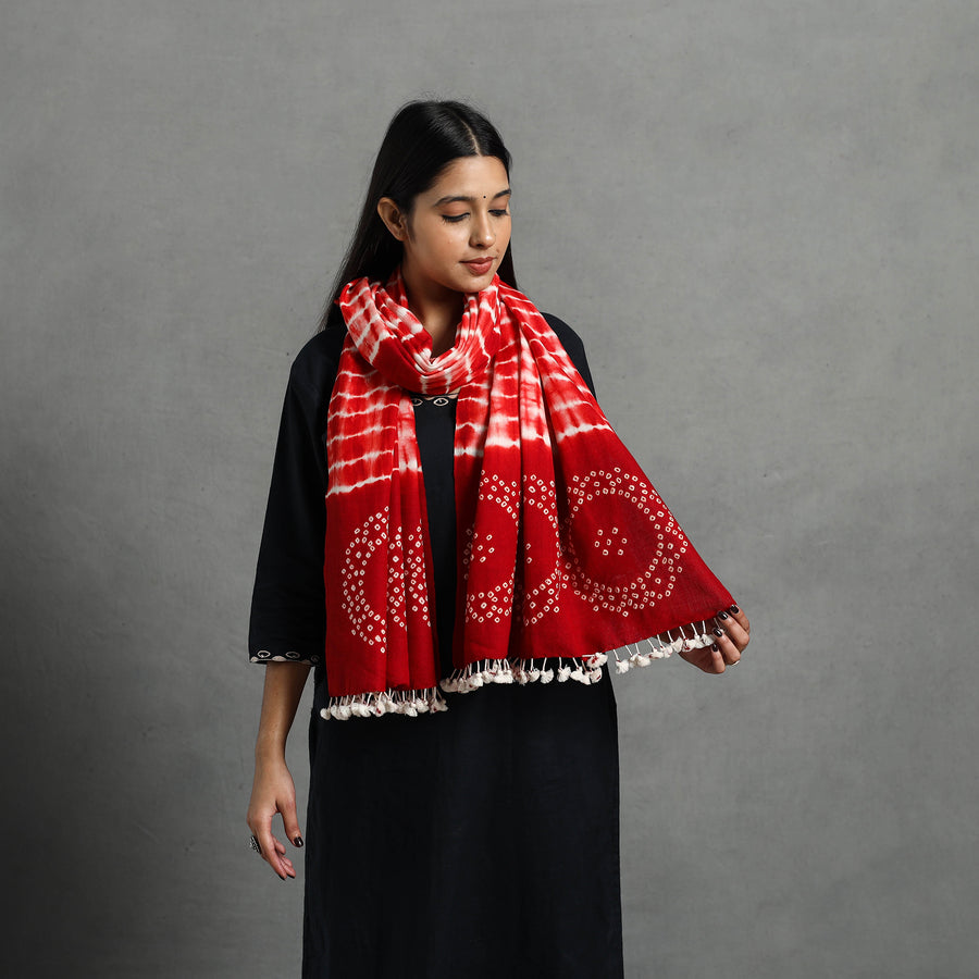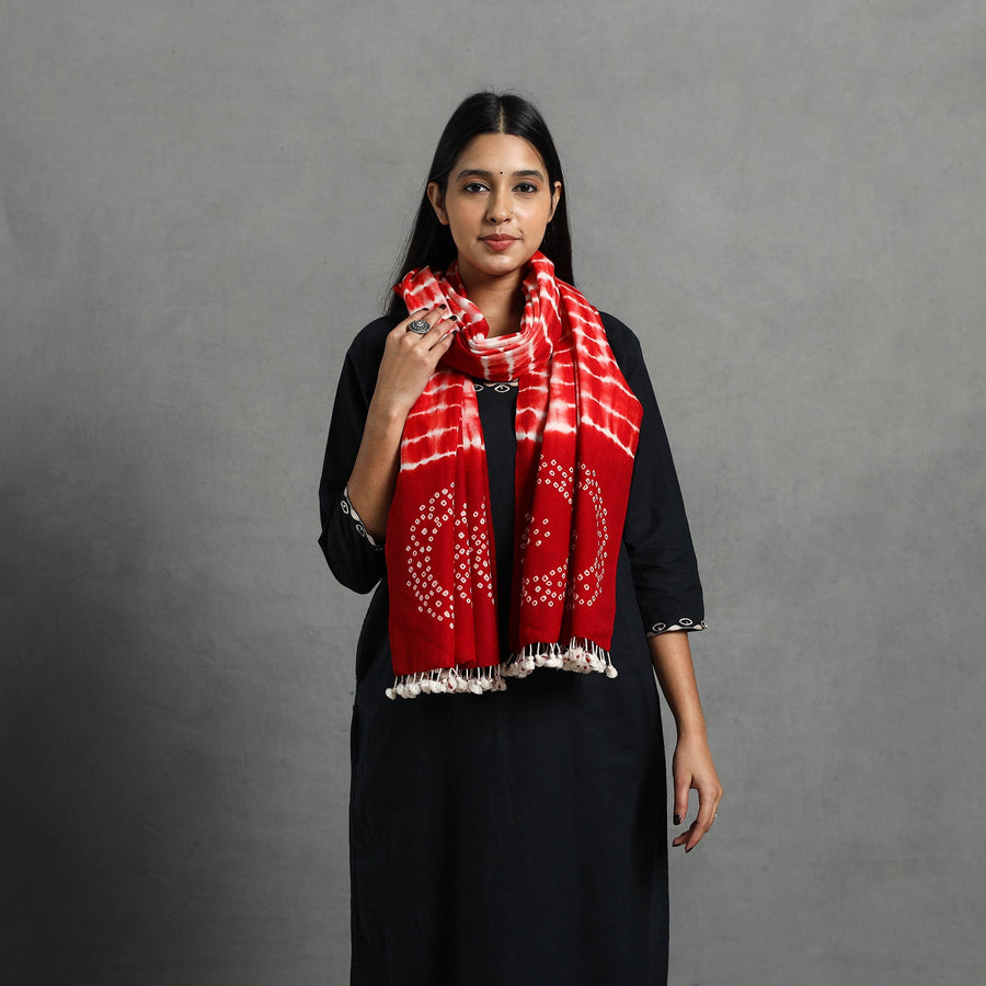 Embrace the heritage of kutch with this red handwoven merino wool tie-dye shibori & bandhani stole with tassels. Handwoven by artisans, it features the traditional shibori & bandhani bagida tie-dye pattern, a hallmark of Kutchi craft. The soft, merino wool ensures comfort and warmth, while the unique patterns add a touch of timeless elegance. Perfect for elevating any outfit.
