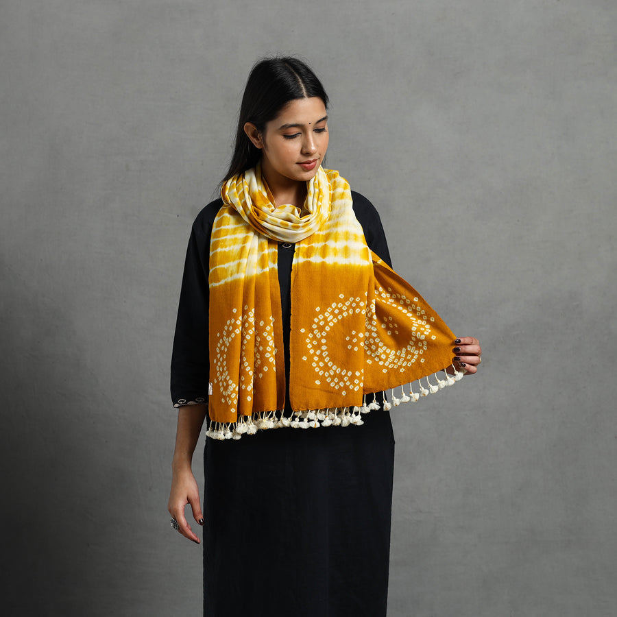 Embrace the heritage of kutch with this yellow handwoven merino wool tie-dye shibori & bandhani stole with tassels. Handwoven by artisans, it features the traditional shibori & bandhani bagida tie-dye pattern, a hallmark of Kutchi craft. The soft, merino wool ensures comfort and warmth, while the unique patterns add a touch of timeless elegance. Perfect for elevating any outfit.
