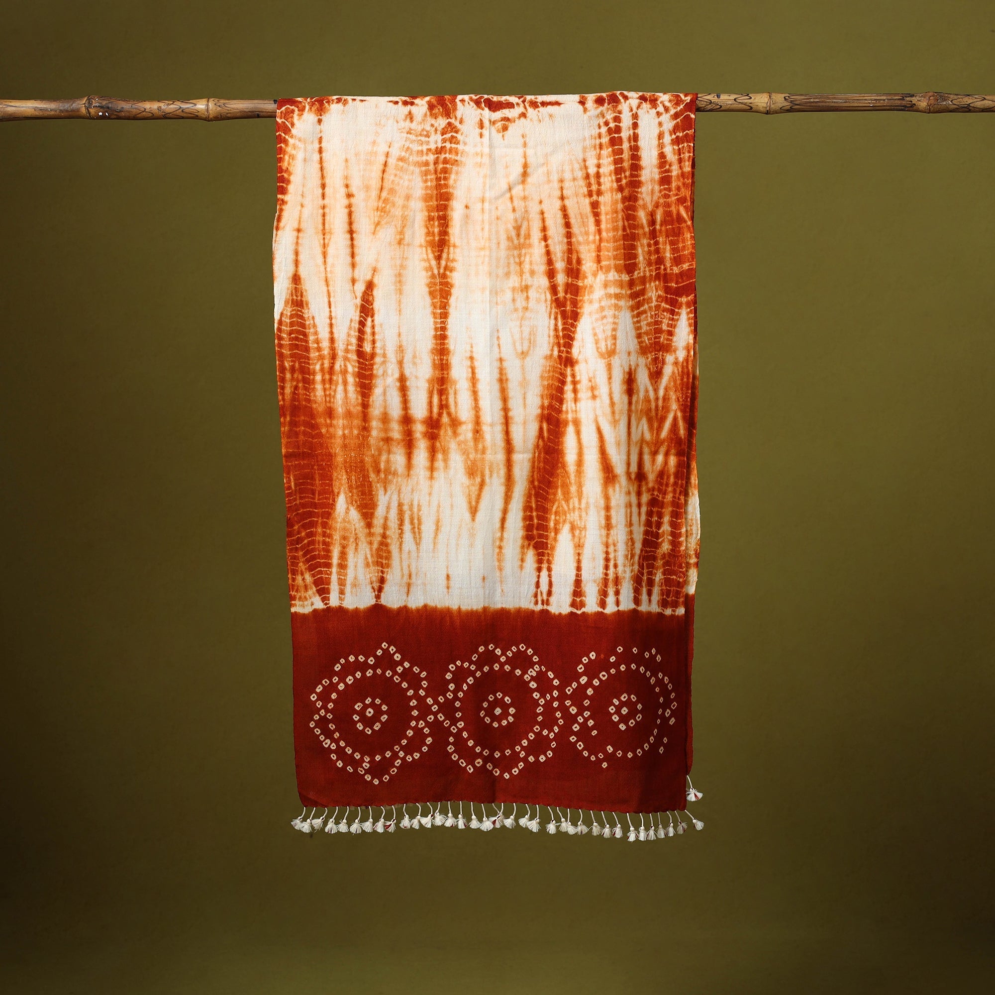 Red handwoven shibori and bandhani tie-dye merino wool stole featuring tassels and showcasing the artistry of Kutch, Gujarat. Crafted by skilled artisan Vankar Bhimji Kanji, it blends traditional charm with a contemporary touch. It adds grace to both everyday outfits and festive looks while offering comforting warmth, making it a beautiful choice for chilly days.
