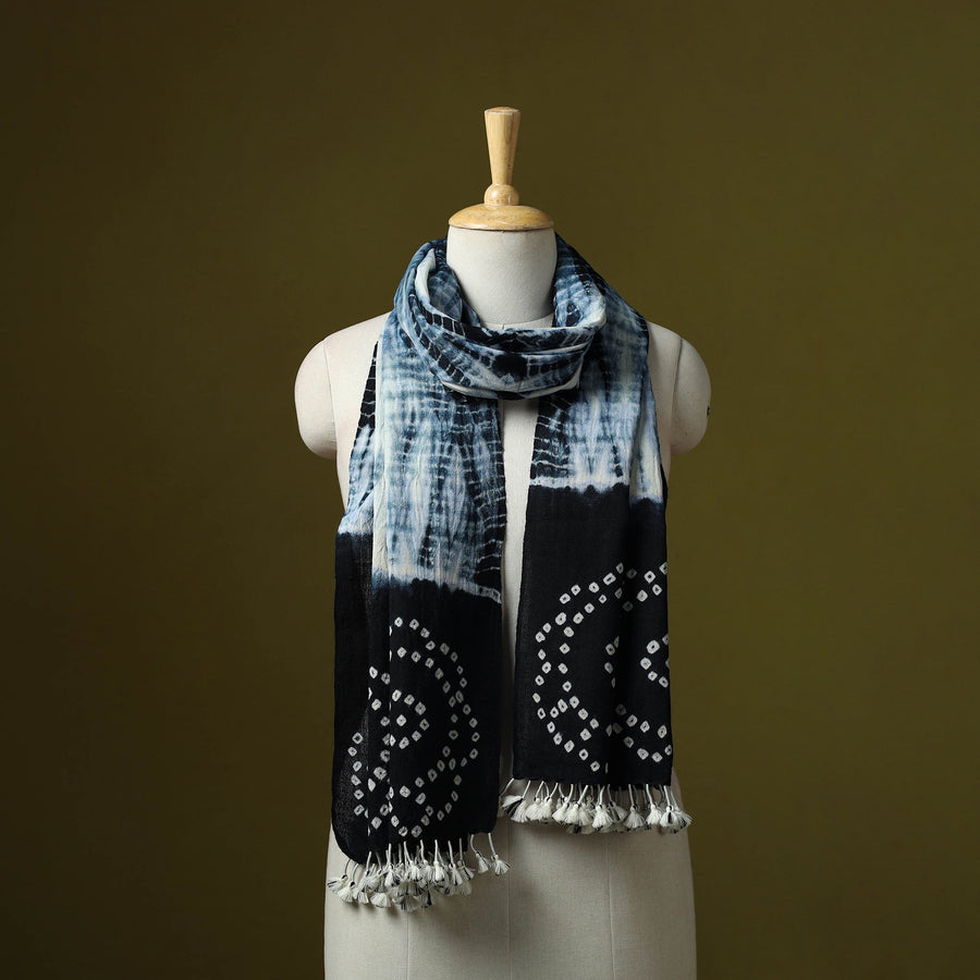 Black handwoven shibori and bandhani tie-dye merino wool stole featuring tassels and showcasing the artistry of Kutch, Gujarat. Crafted by skilled artisan Vankar Bhimji Kanji, it blends traditional charm with a contemporary touch. It adds grace to both everyday outfits and festive looks while offering comforting warmth, making it a beautiful choice for chilly days.