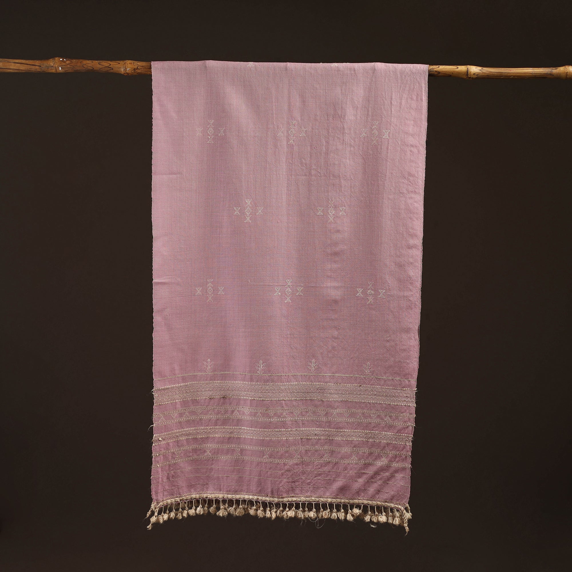 Pink handwoven stole crafted by Vankar Bhimji Kanji from Kutch. Made from merino wool with a tussar silk weaving design and tassels, it offers dependable warmth, perfect for chilly days. Ideal for everyday wear, travel, thoughtful gifting or adding an artisanal flair to your special outfits.