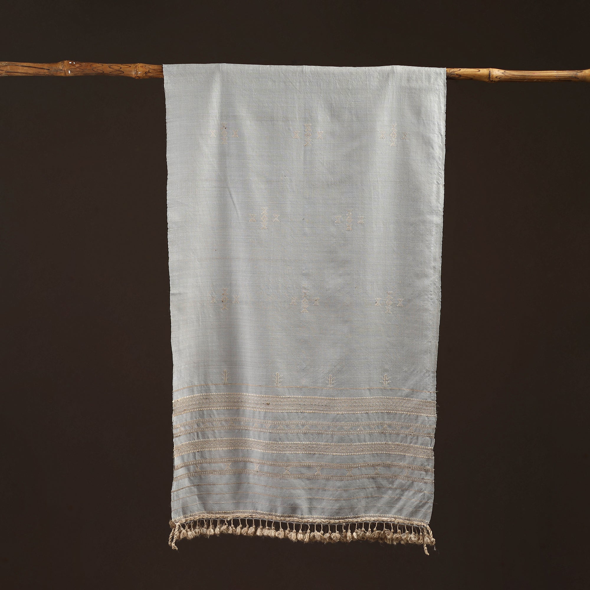 Handwoven stole crafted by Vankar Bhimji Kanji from Kutch. Made from merino wool with a tussar silk weaving design and tassels, it offers dependable warmth, perfect for chilly days. Ideal for everyday wear, travel, thoughtful gifting or adding an artisanal flair to your special outfits.