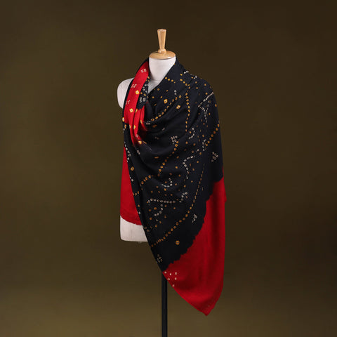 | Material | Black handwoven bandhani tie-dye merino wool shawl showcasing the artistry of Kutch Gujarat. Crafted by skilled artisan Vankar Bhimji Kanji it blends traditional charm with a contemporary touch. It adds grace to both everyday outfits and festive looks while offering comforting warmth making it a beautiful choice for chilly days. |