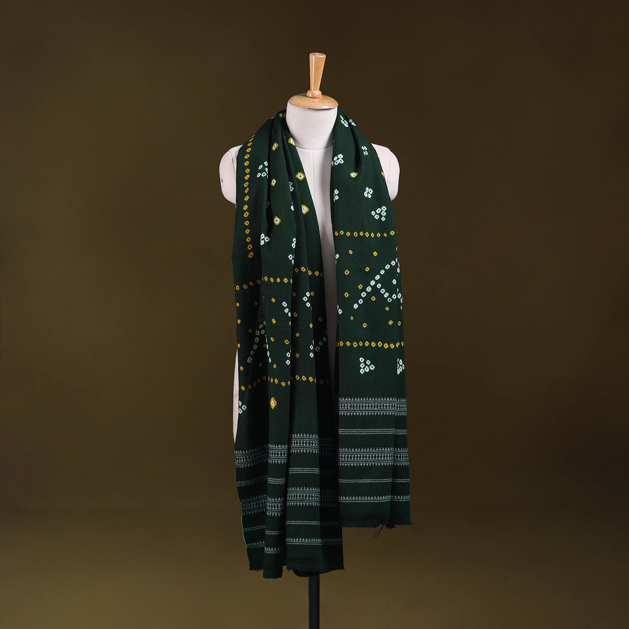 Handwoven bandhani tie-dye merino wool shawl showcasing the artistry of Kutch Gujarat. Crafted by skilled artisan Vankar Bhimji Kanji it blends traditional charm with a contemporary touch. It adds grace to both everyday outfits and festive looks while offering comforting warmth making it a beautiful choice for chilly days.