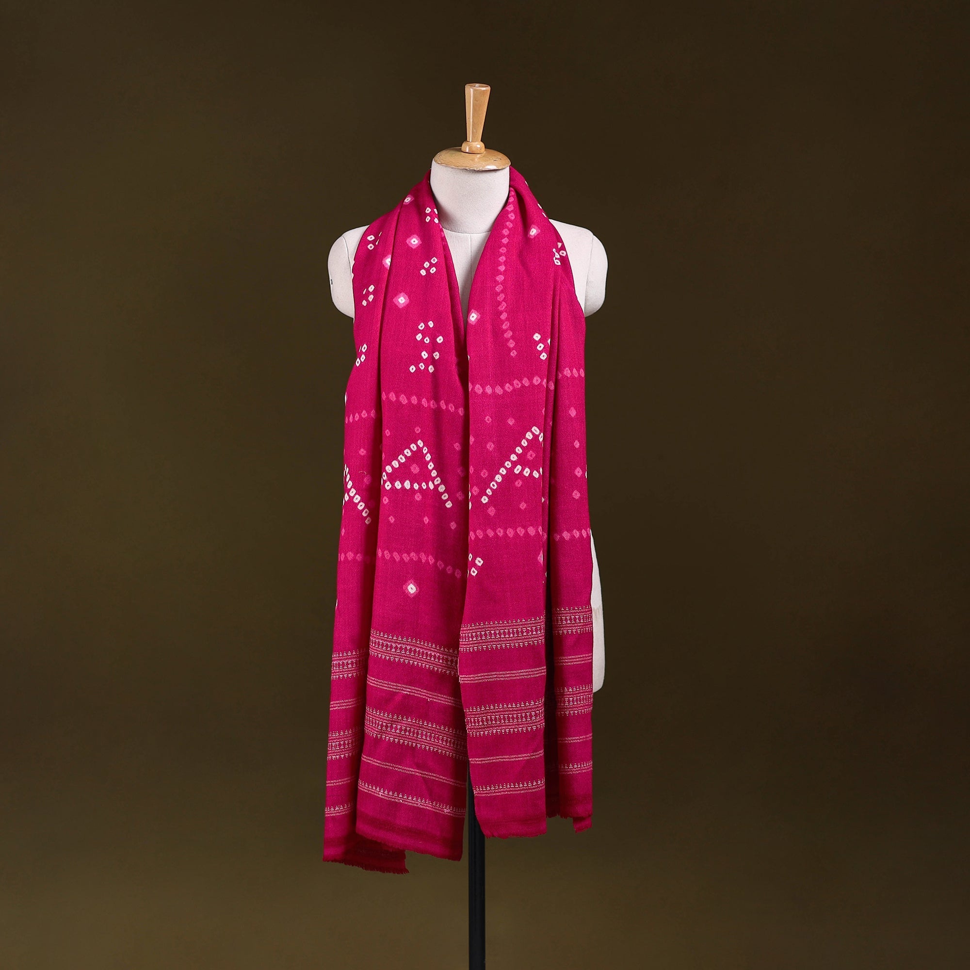 Pink handwoven bandhani tie-dye merino wool shawl showcasing the artistry of Kutch Gujarat. Crafted by skilled artisan Vankar Bhimji Kanji it blends traditional charm with a contemporary touch. It adds grace to both everyday outfits and festive looks while offering comforting warmth making it a beautiful choice for chilly days.