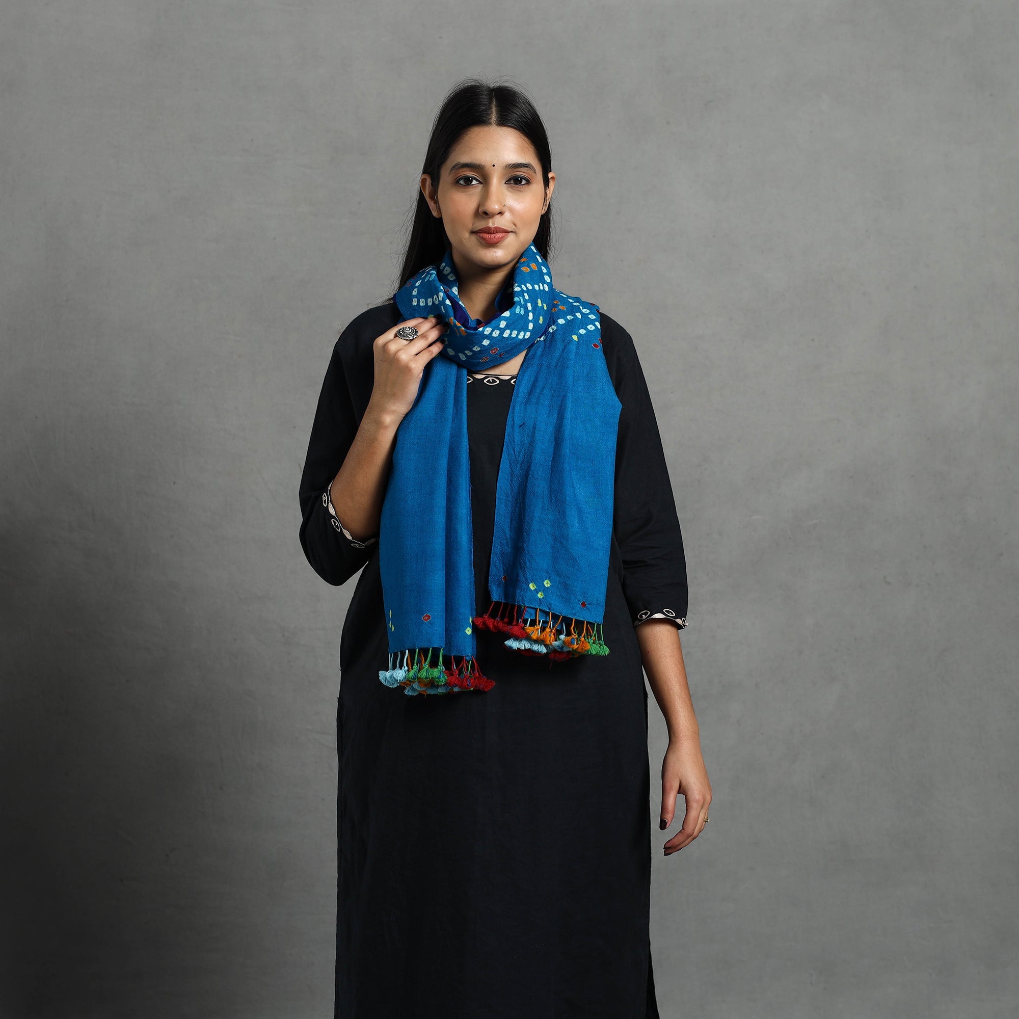 Embrace the heritage of kutch with this blue handwoven merino wool tie-dye bandhani stole with tassels. Handwoven by artisans, it features the traditional bandhani bagida tie-dye pattern, a hallmark of Kutchi craft. The soft, merino wool ensures comfort and warmth, while the unique patterns add a touch of timeless elegance. Perfect for elevating any outfit.