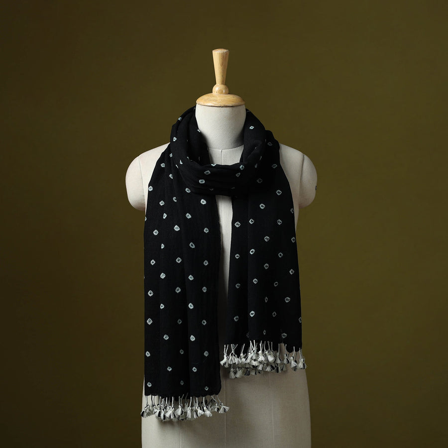 Black handwoven bandhani tie-dye merino wool stole featuring tassels and showcasing the artistry of Kutch, Gujarat. Crafted by skilled artisan Vankar Bhimji Kanji, it blends traditional charm with a contemporary touch. It adds grace to both everyday outfits and festive looks while offering comforting warmth, making it a beautiful choice for chilly days.