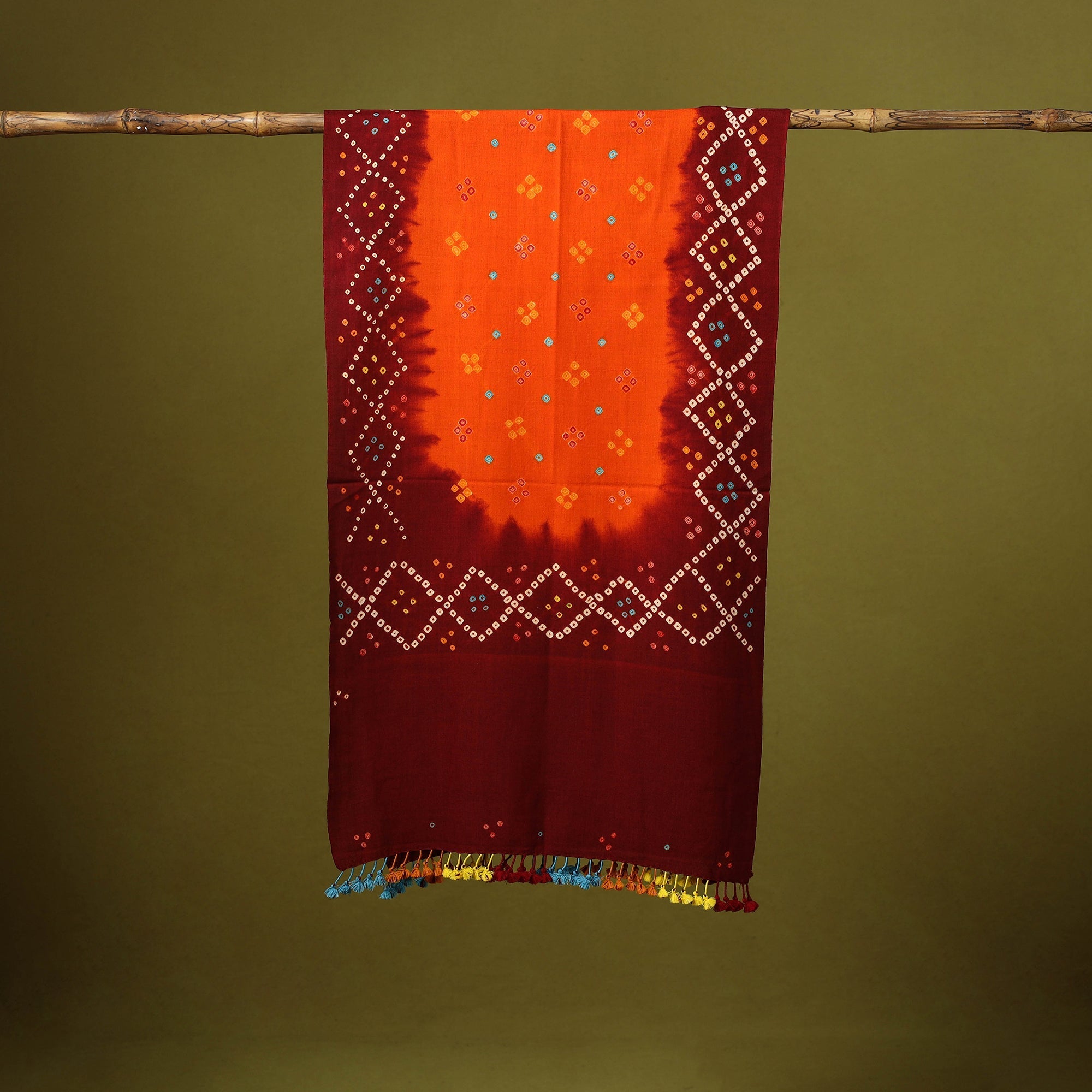 Maroon handwoven bandhani tie-dye merino wool stole featuring tassels and showcasing the artistry of Kutch, Gujarat. Crafted by skilled artisan Vankar Bhimji Kanji, it blends traditional charm with a contemporary touch. It adds grace to both everyday outfits and festive looks while offering comforting warmth, making it a beautiful choice for chilly days.