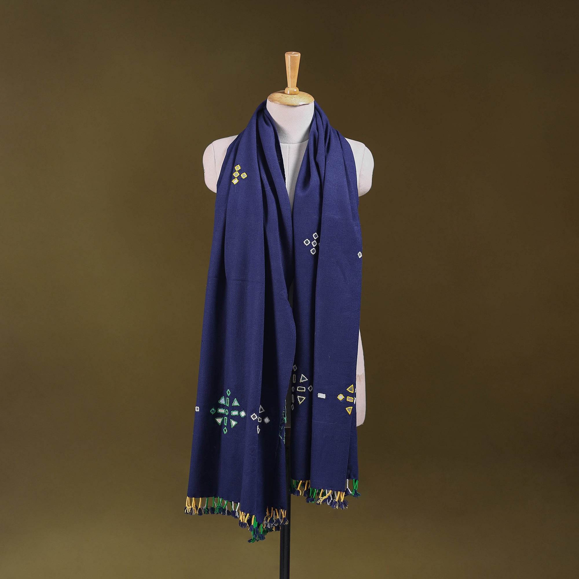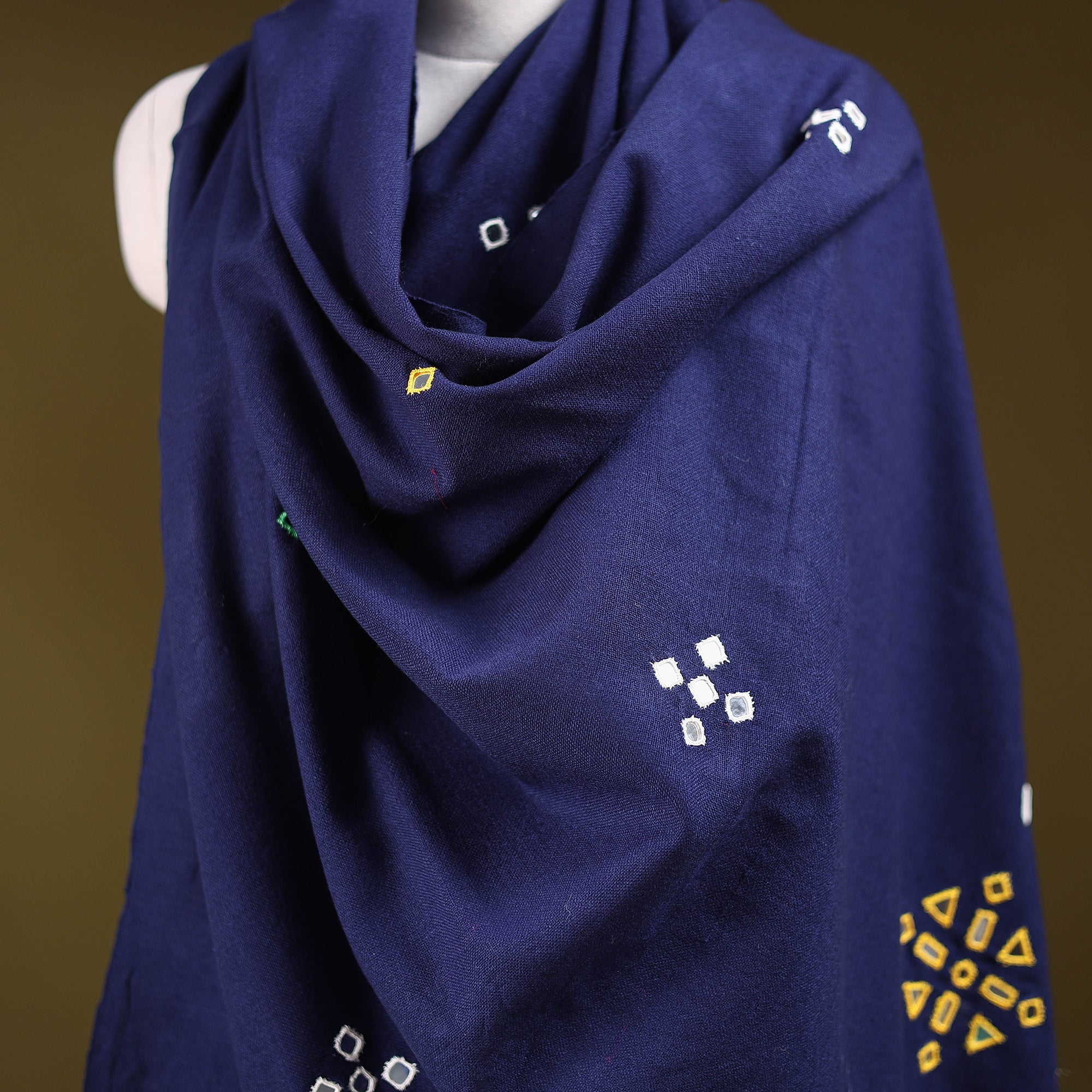 Blue kutch handwoven shawl created by skilled artisan Vankar Bhimji Kanji from Bhuj Gujarat. Adorned with traditional mirror work. Made from acrylic wool it offers both warmth and comfort. A perfect blend of tradition and style ideal for everyday elegance or festive wear.