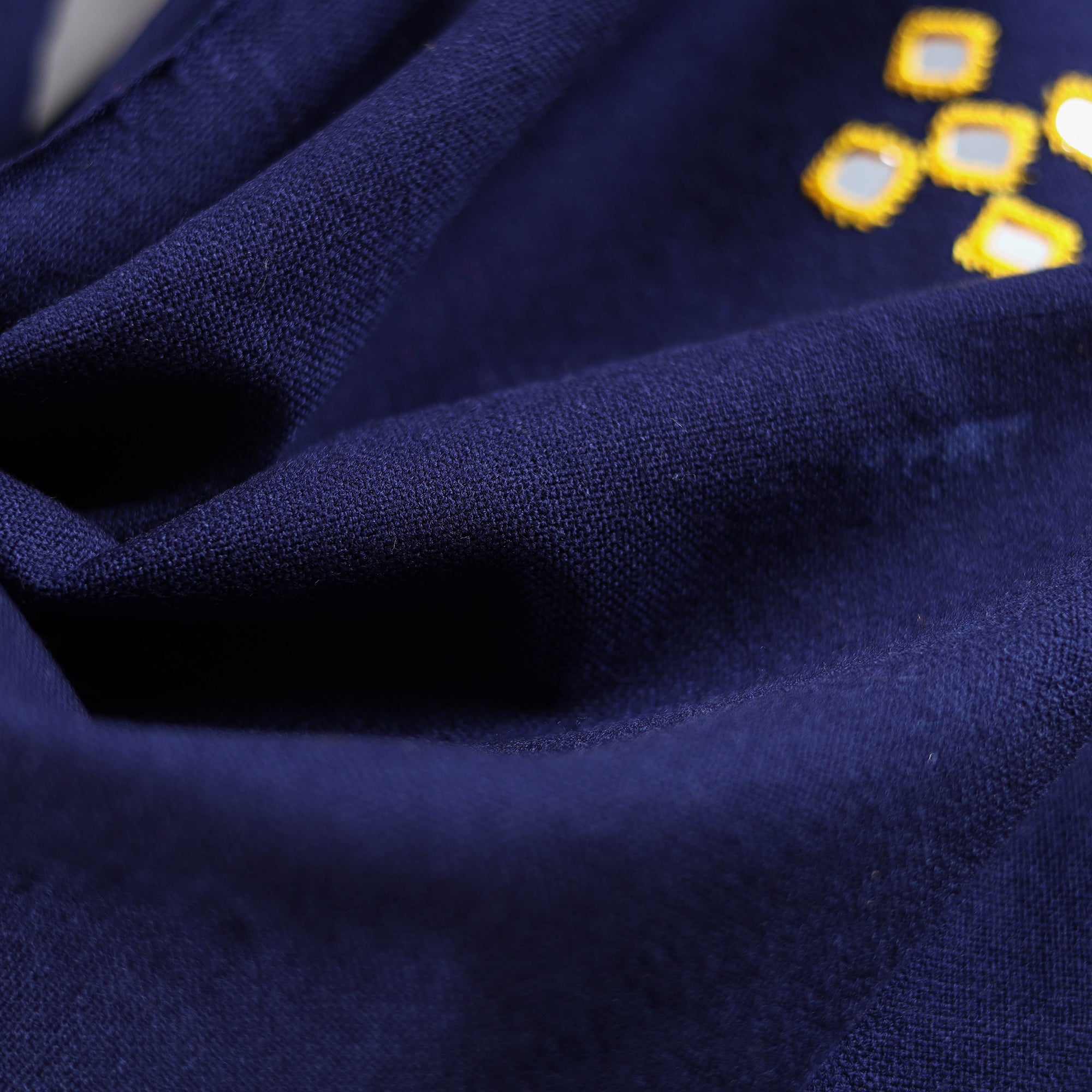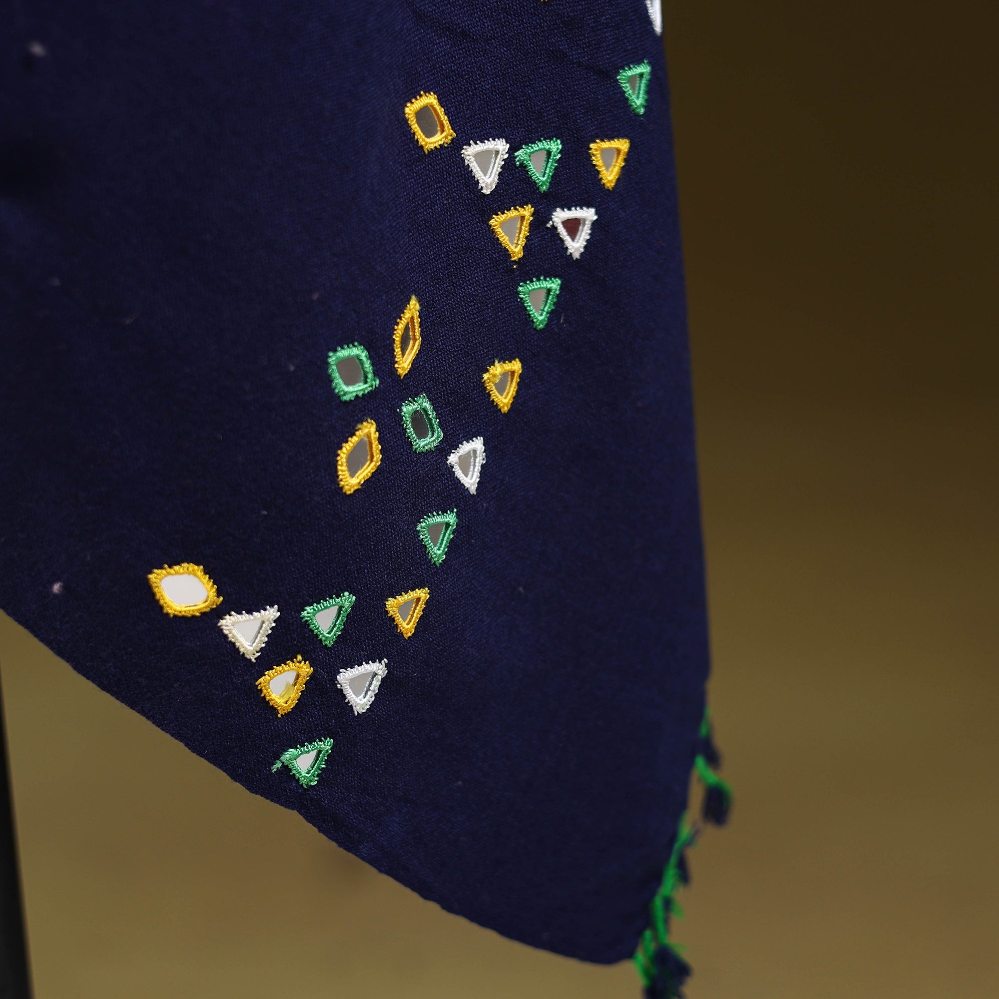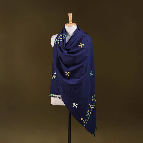 Blue kutch handwoven shawl created by skilled artisan Vankar Bhimji Kanji from Bhuj Gujarat. Adorned with traditional mirror work. Made from acrylic wool it offers both warmth and comfort. A perfect blend of tradition and style ideal for everyday elegance or festive wear.