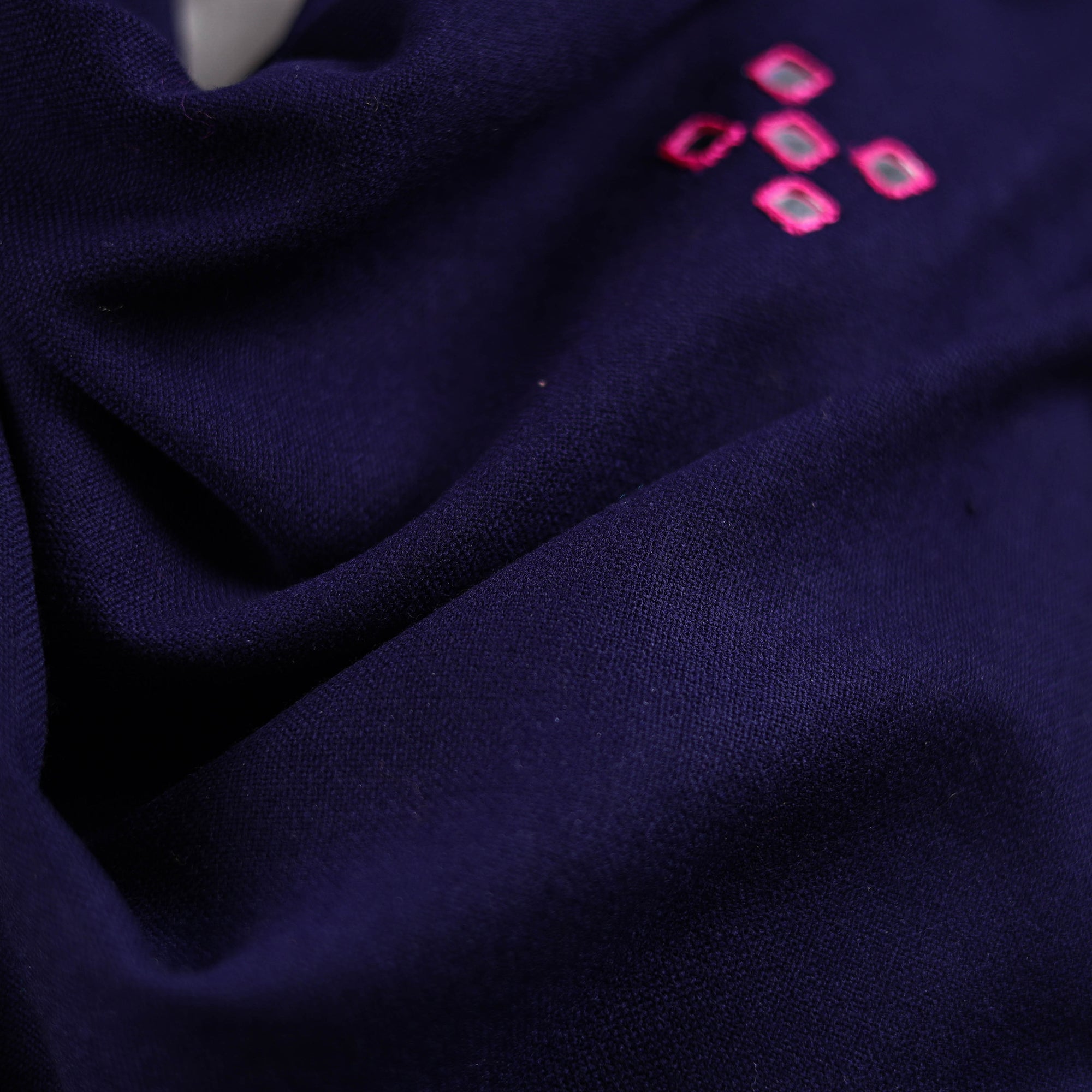 Blue kutch handwoven shawl created by skilled artisan Vankar Bhimji Kanji from Bhuj Gujarat. Adorned with traditional mirror work. Made from acrylic wool it offers both warmth and comfort. A perfect blend of tradition and style ideal for everyday elegance or festive wear.