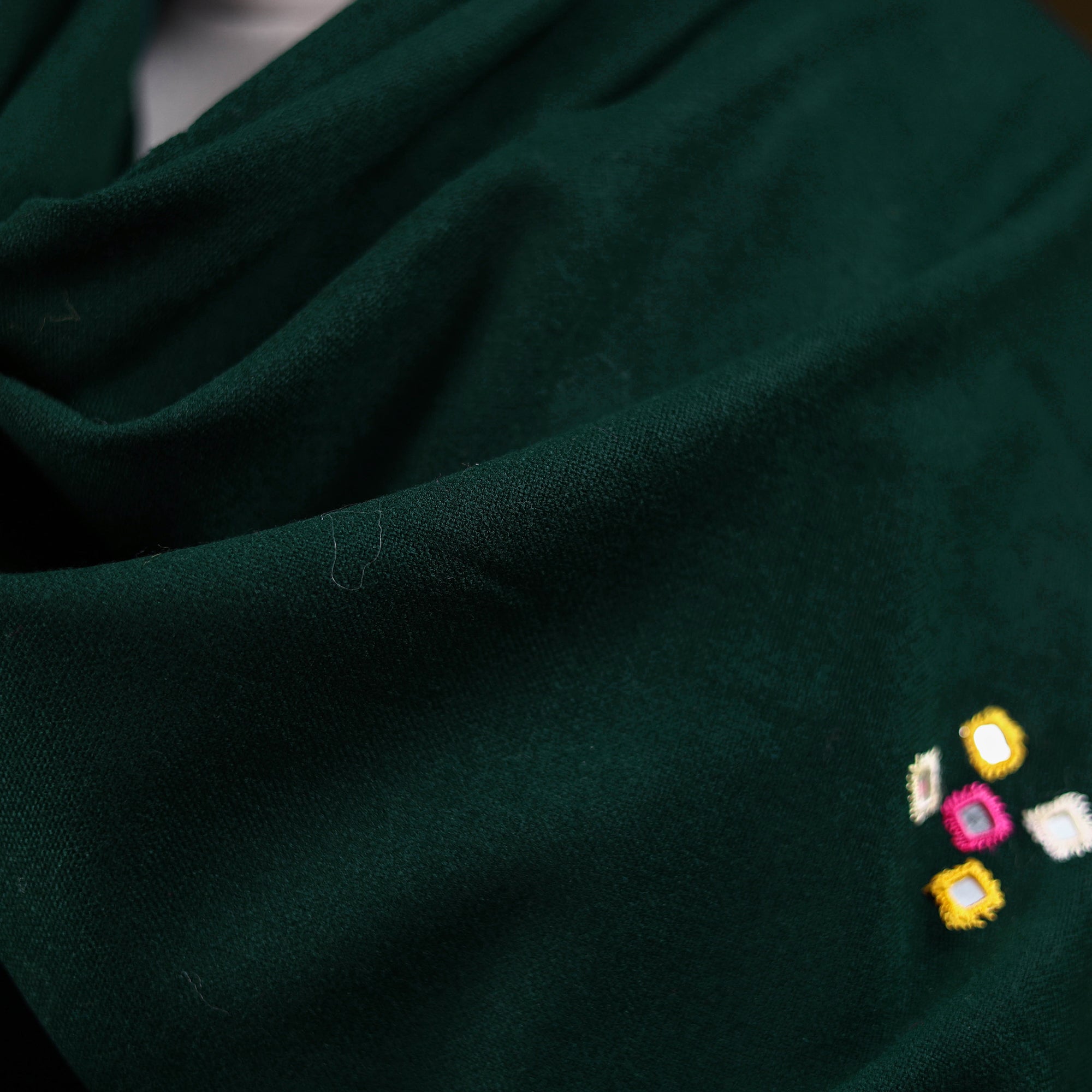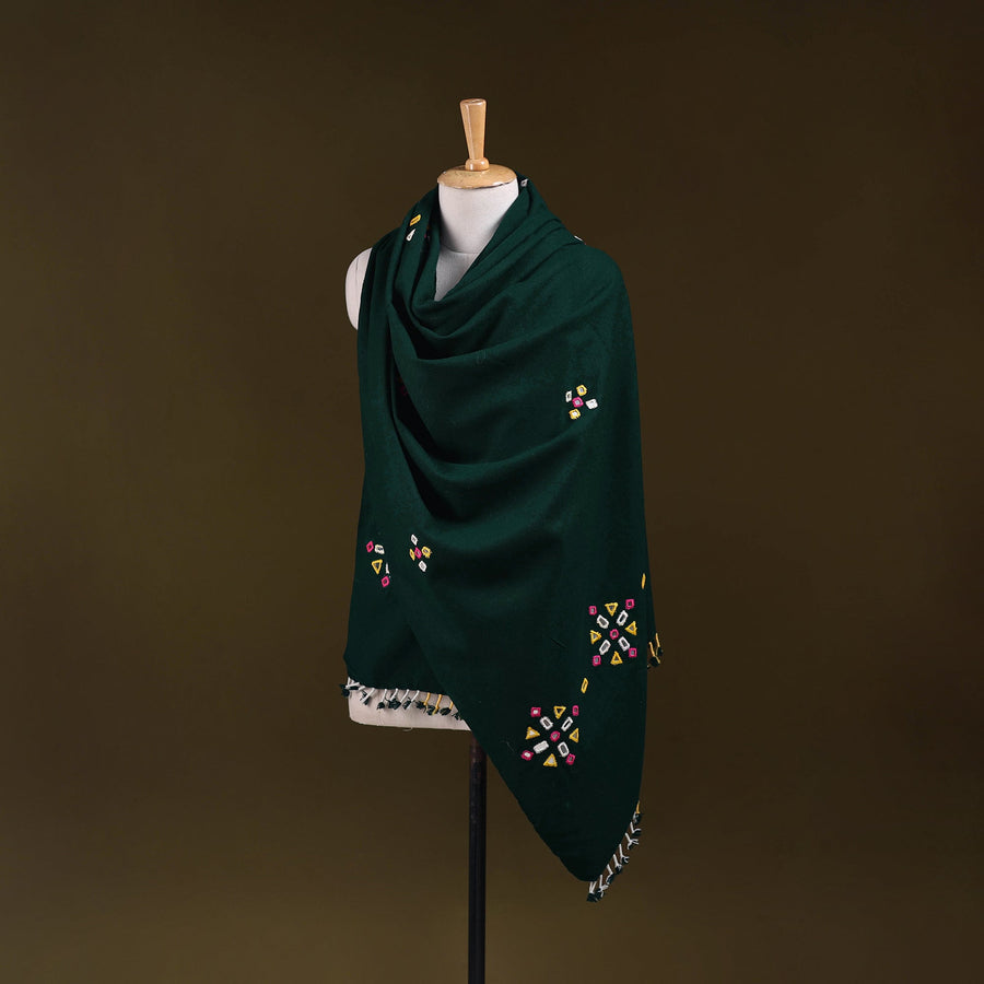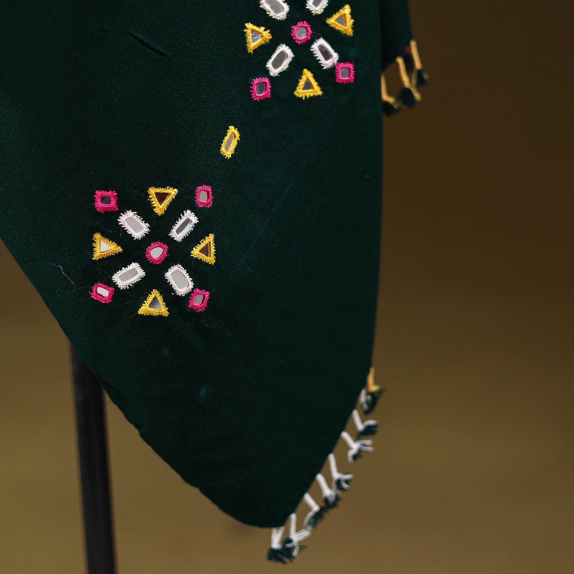 Green kutch handwoven shawl created by skilled artisan Vankar Bhimji Kanji from Bhuj Gujarat. Adorned with traditional mirror work. Made from acrylic wool it offers both warmth and comfort. A perfect blend of tradition and style ideal for everyday elegance or festive wear.