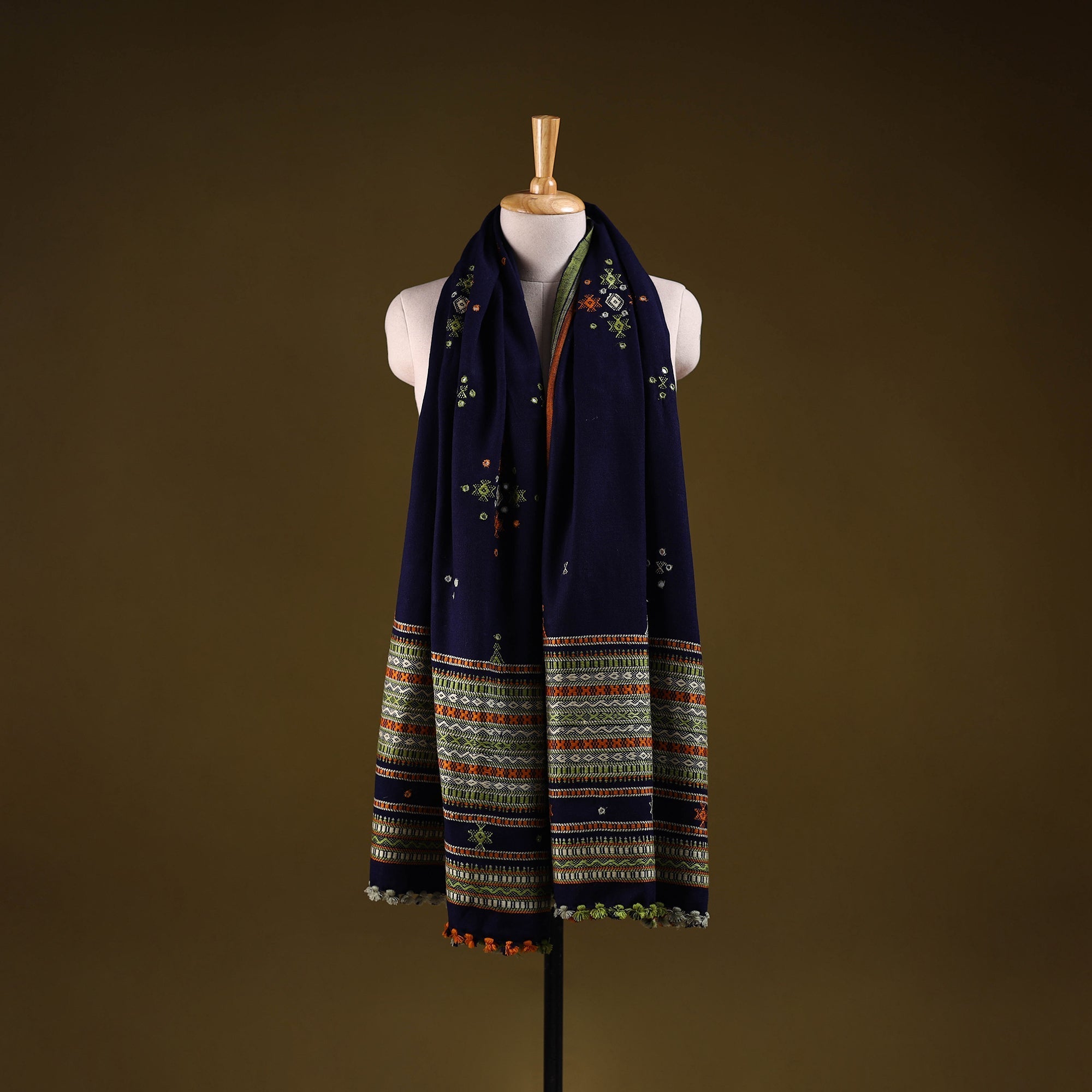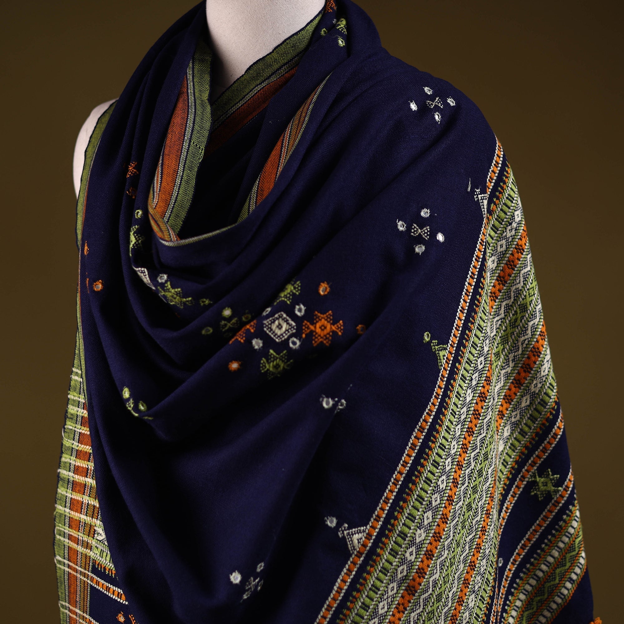 Blue kutch handwoven shawl crafted by skilled artisan Vankar Bhimji Kanji from Bhuj Gujarat. Adorned with traditional mirror work and intricate chomuk buta and kutchi motifs. Made from acrylic wool it offers both warmth and comfort. A perfect blend of tradition and style ideal for winter wear.