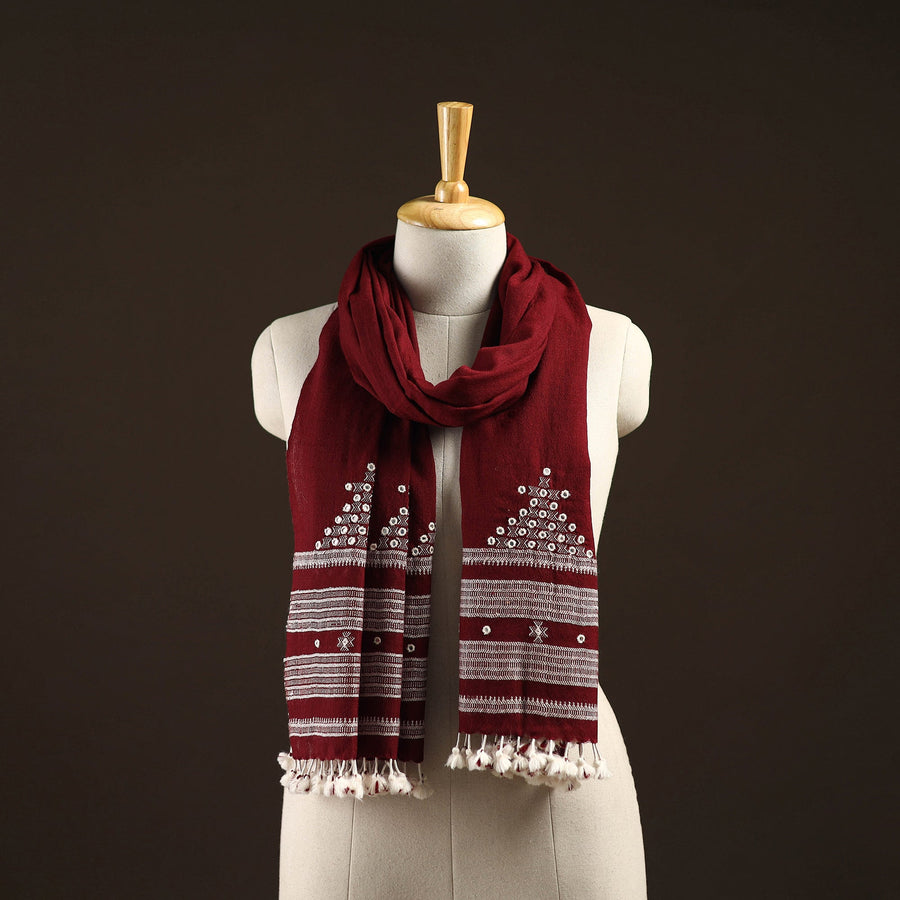 Maroon handwoven stole with tassels crafted by Vankar Bhimji Kanji from Kutch. Adorned with mirror work and hand embroidery techniques rooted in Kutch’s cultural traditions. Crafted from merino wool, it offers dependable warmth, perfect for chilly days. Ideal for everyday use, travel, thoughtful gifting or adding an artisanal flair to your special outfits.
