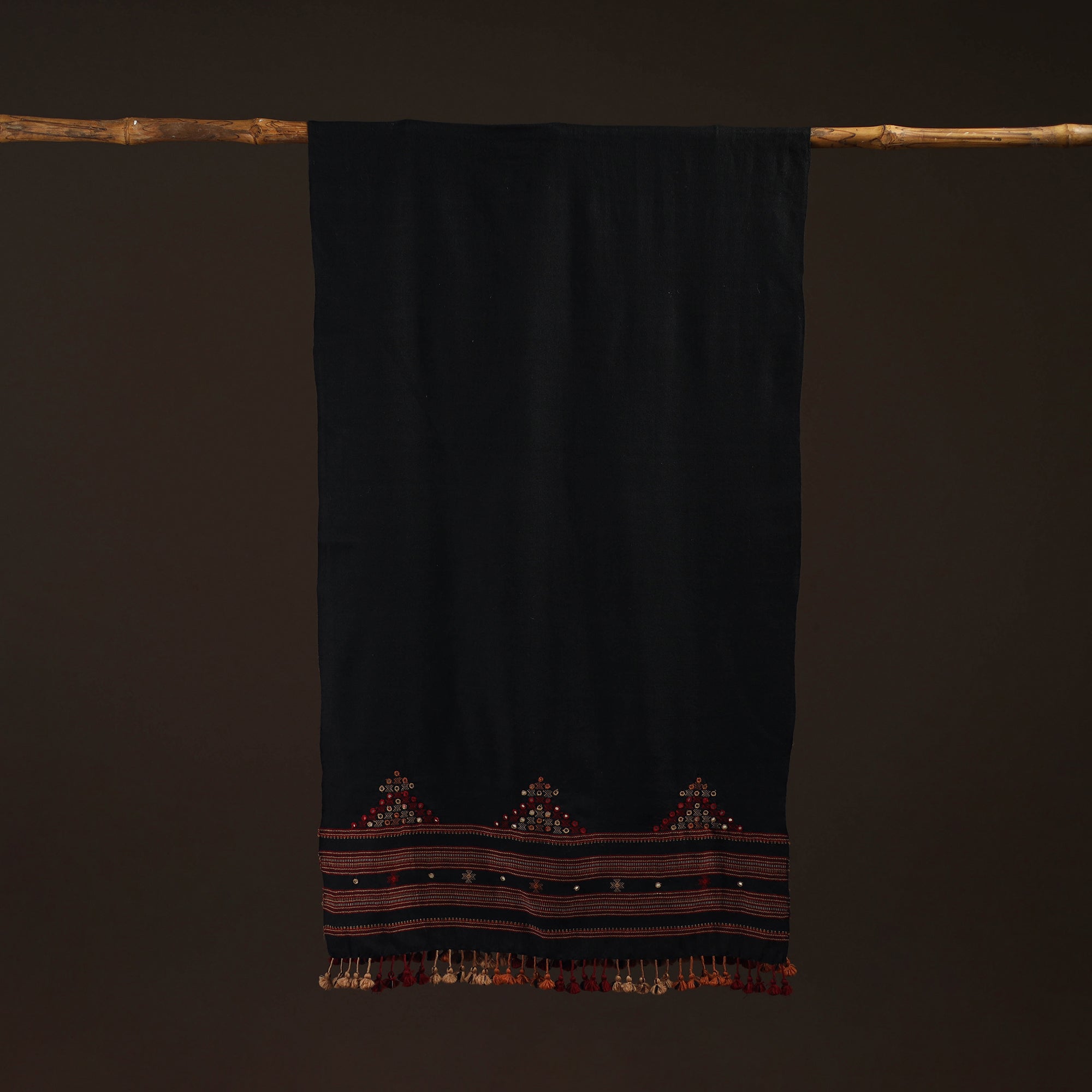 | Material | Black handwoven stole with tassels crafted by Vankar Bhimji Kanji from Kutch. Adorned with mirror work and hand embroidery techniques rooted in Kutch’s cultural traditions. Crafted from merino wool, it offers dependable warmth, perfect for chilly days. Ideal for everyday use, travel, thoughtful gifting or adding an artisanal flair to your special outfits. Note: This piece carries tiny knots, thread pulls or uneven lines not flaws but fingerprints. Every irregularity is a whisper from the hands that made it. It’s what happens when tradition weaves through time not machines. If you’re looking for perfection, this isn’t it. But if you’re looking for soul you’ve found it. |