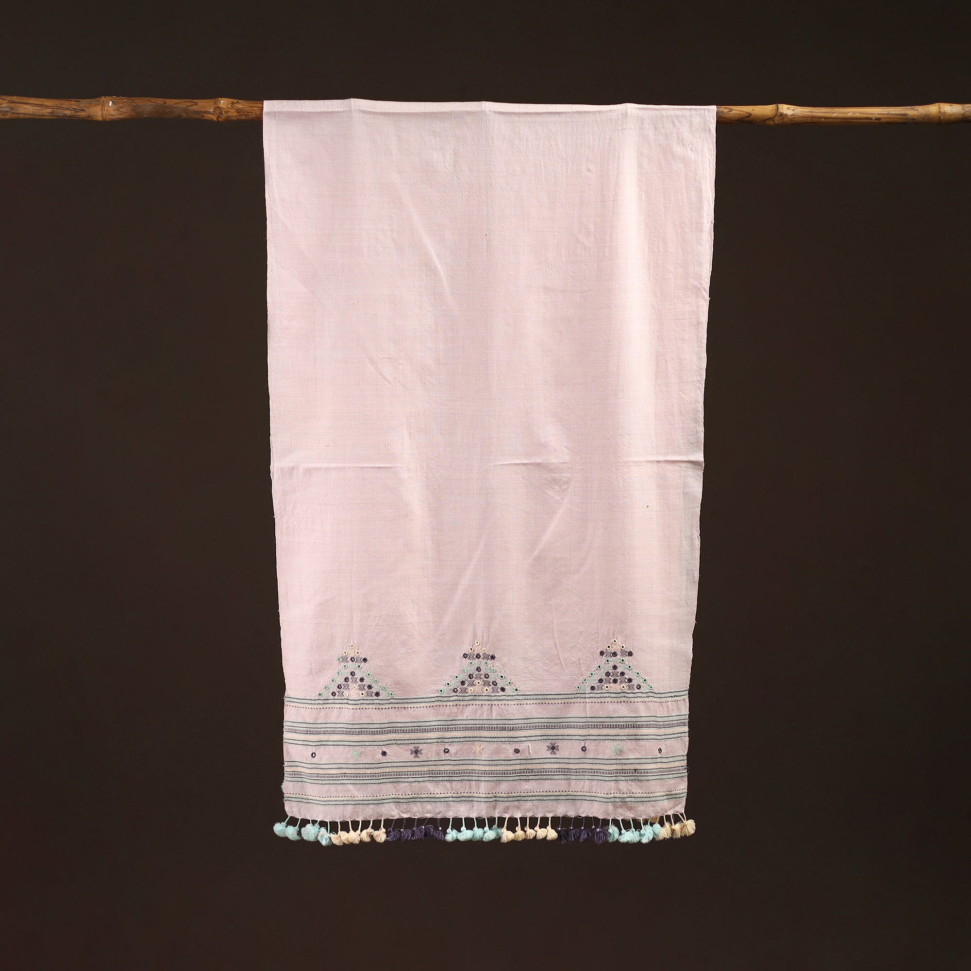 Pink handwoven stole with tassels crafted by Vankar Bhimji Kanji from Kutch. Adorned with mirror work and hand embroidery techniques rooted in Kutch’s cultural traditions. Crafted from merino wool, it offers dependable warmth, perfect for chilly days. Ideal for everyday use, travel, thoughtful gifting or adding an artisanal flair to your special outfits.