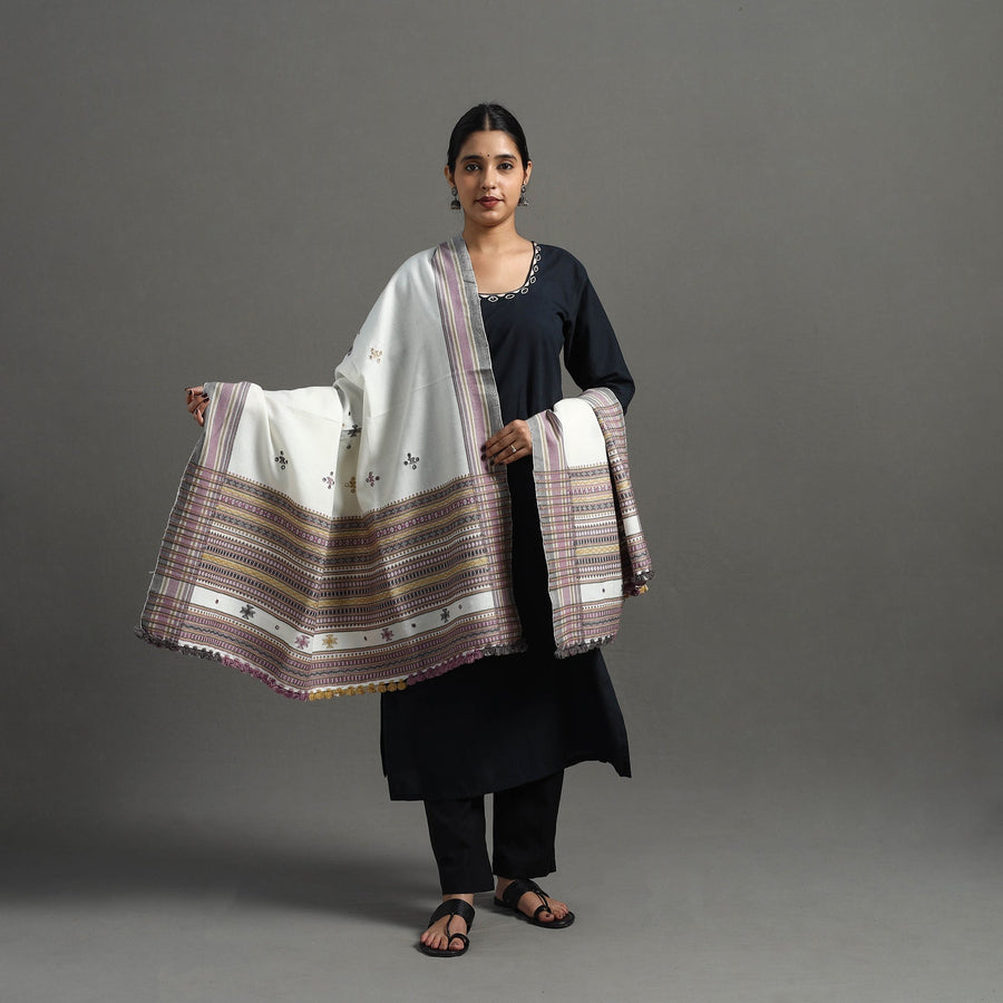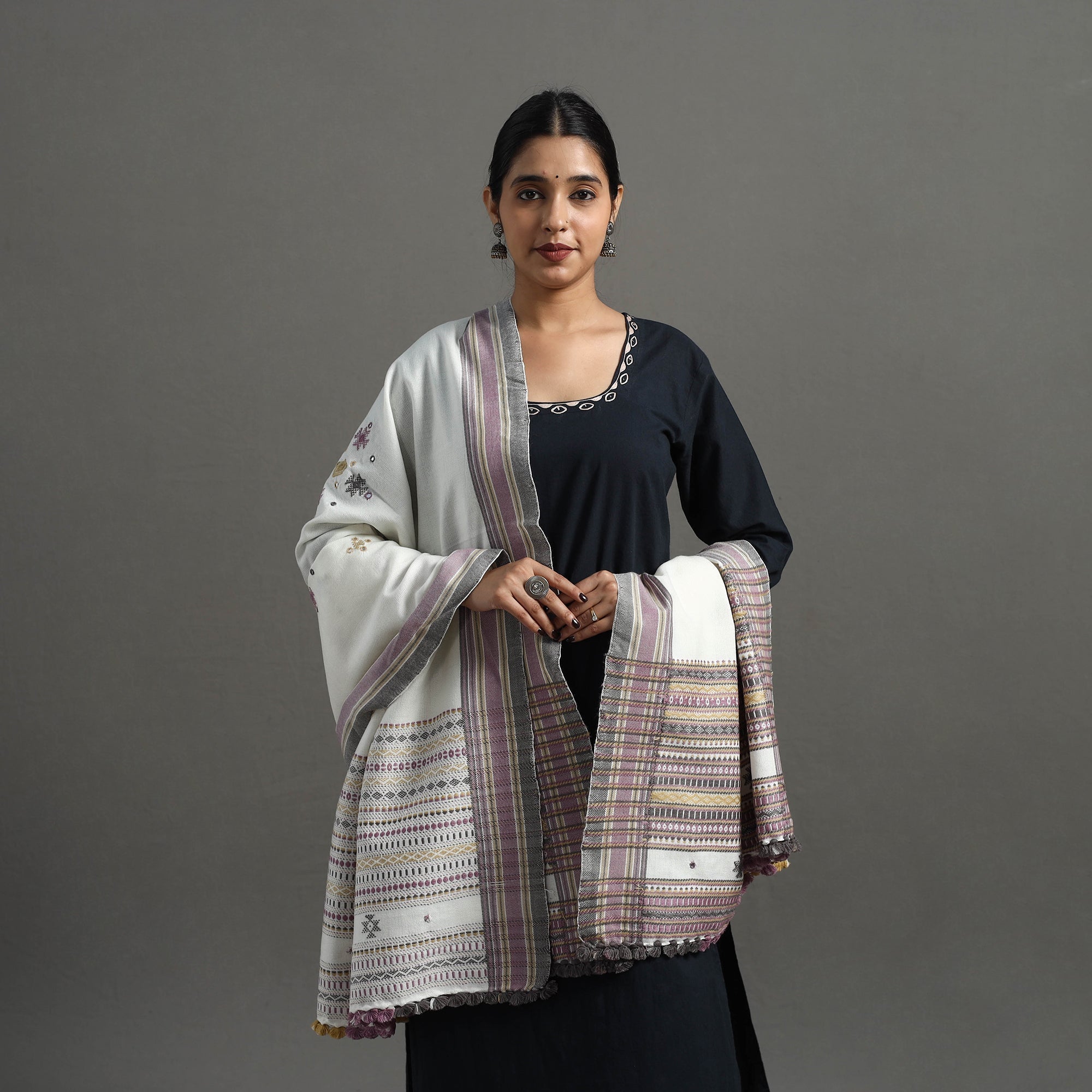 Experience the rich of white kutch handwoven mirror work woollen shawl. Crafted by artisans in Gujarat, this shawl features mirror work and Kutchi motifs. The acrylic wool ensures warmth and comfort