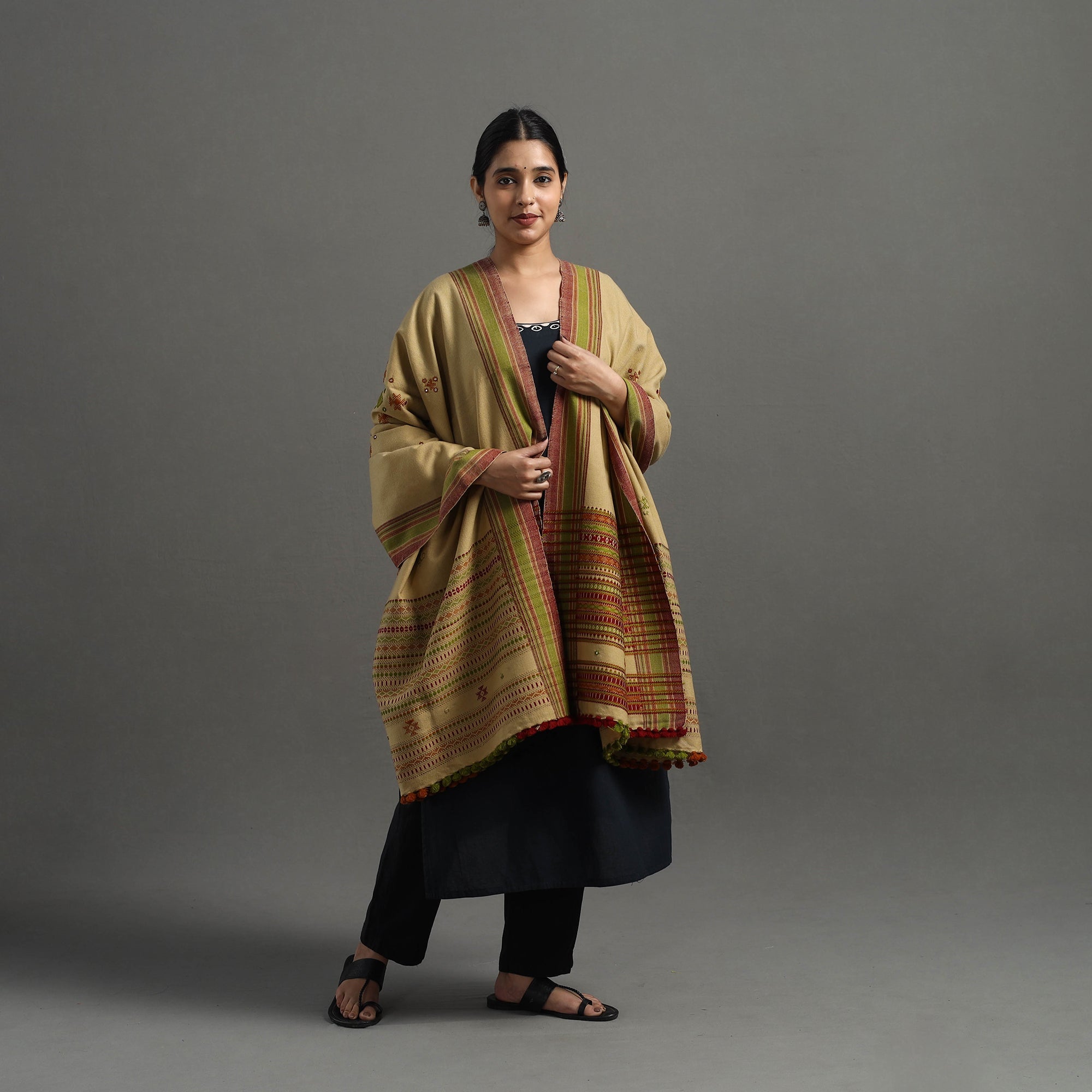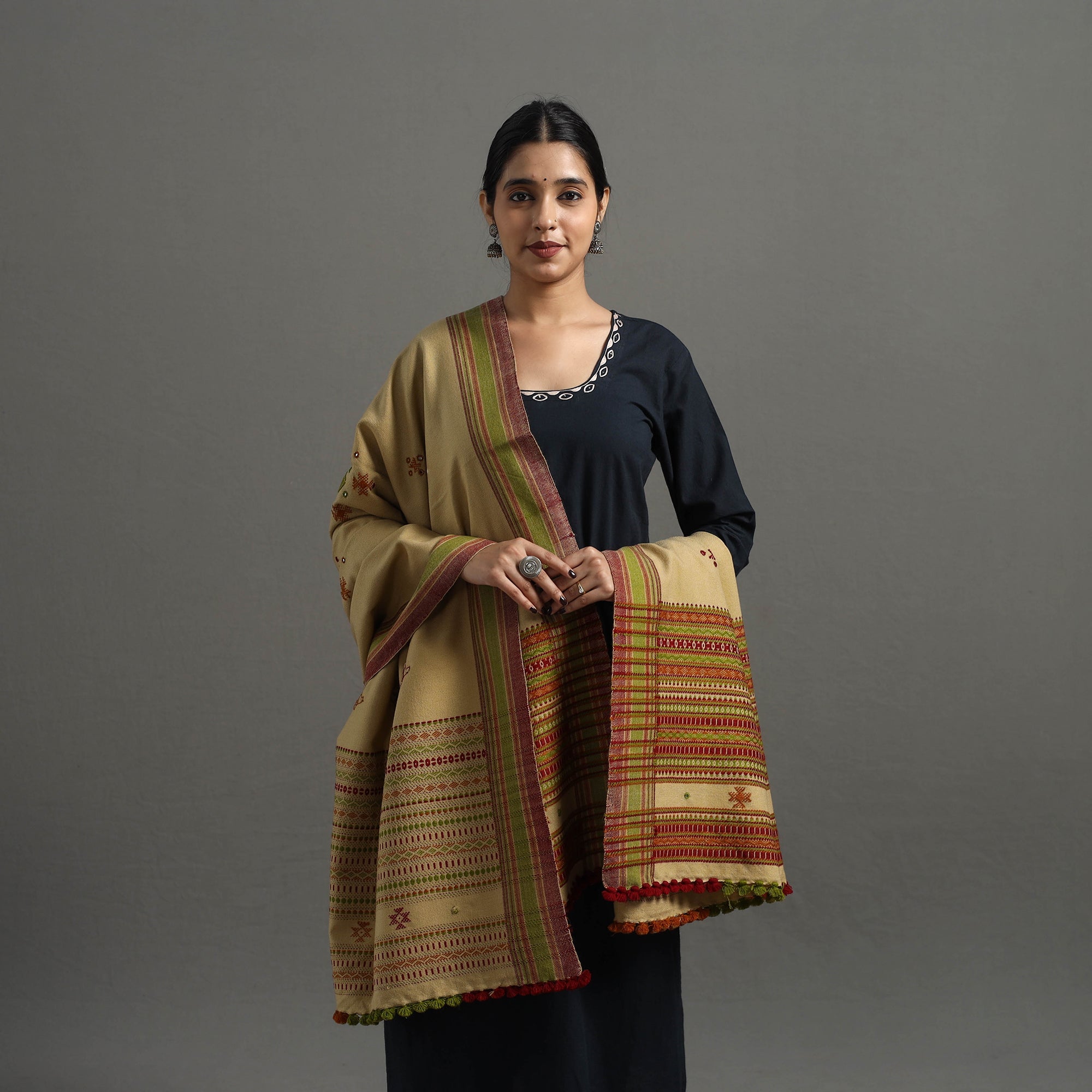 | Material | Experience the rich of beige kutch handwoven mirror work woollen shawl. Crafted by artisans in Gujarat, this shawl features mirror work and Kutchi motifs. The acrylic wool ensures warmth and comfort |