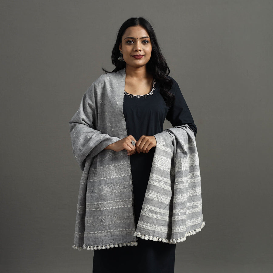 Experience the rich of kutch handwoven mirror work grey woollen shawl. Crafted by artisans in Gujarat, this shawl features mirror work and Kutchi motifs. The acrylic wool ensures warmth and comfort