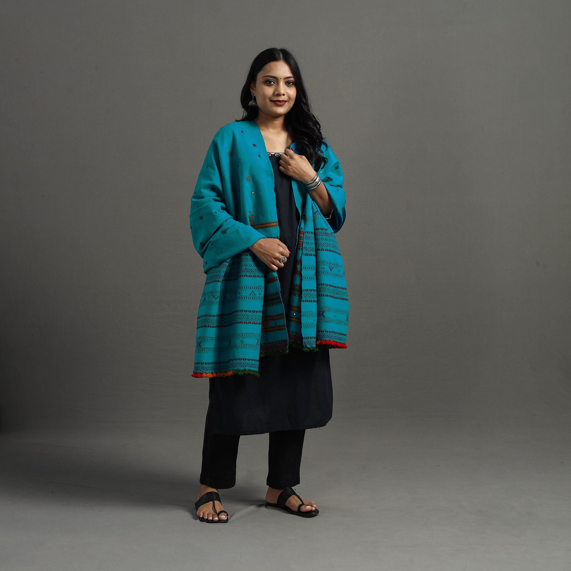 Experience the rich of kutch handwoven mirror work blue woollen shawl. Crafted by artisans in Gujarat, this shawl features mirror work and Kutchi motifs. The acrylic wool ensures warmth and comfort