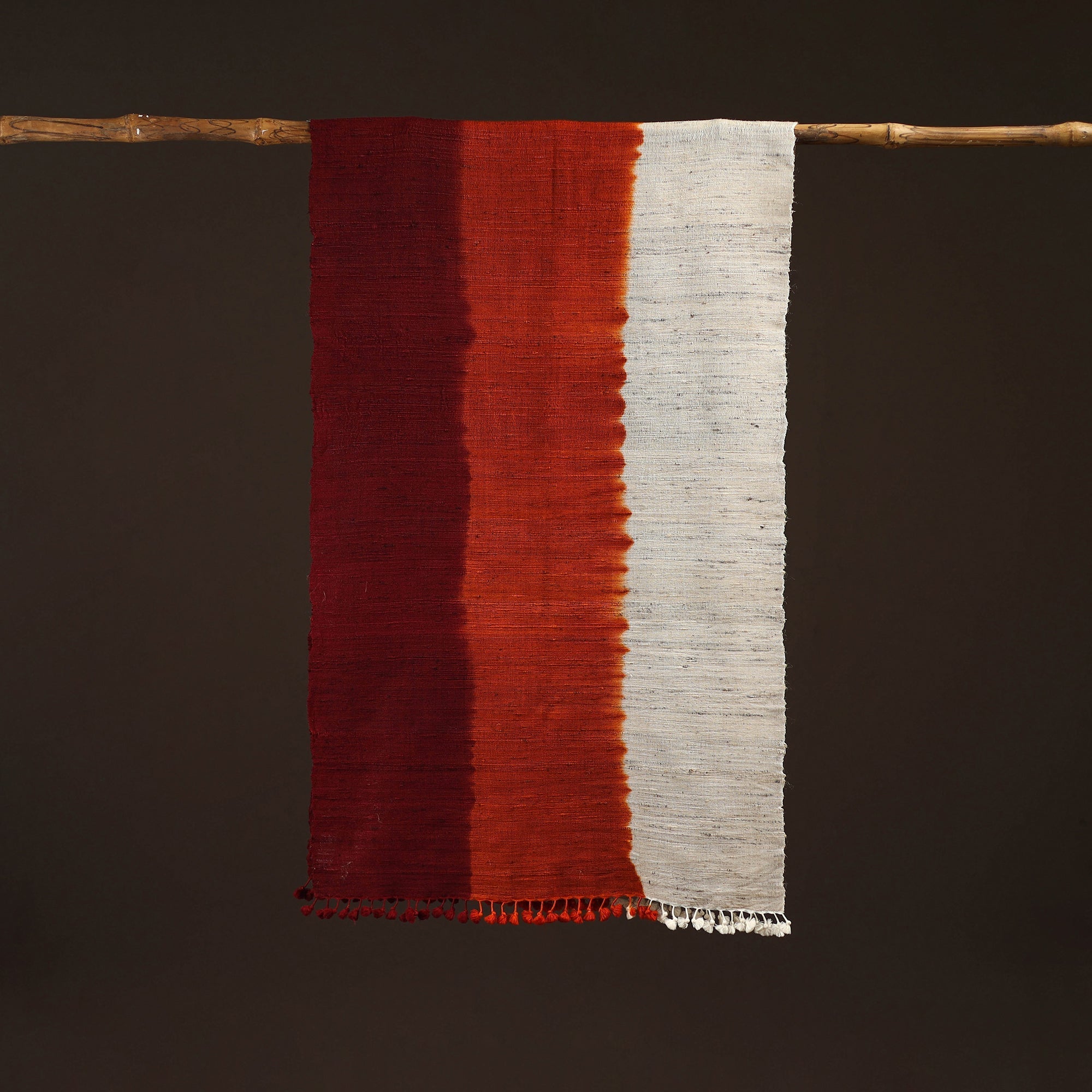 Red handwoven stole crafted by Vankar Bhimji Kanji from Kutch. Featuring a beautifully blended three-shaded palette and tassels. Crafted from merino wool x katia silk, it offers dependable warmth, perfect for chilly days. Ideal for everyday wear, travel, thoughtful gifting or adding an artisanal flair to your special outfits.