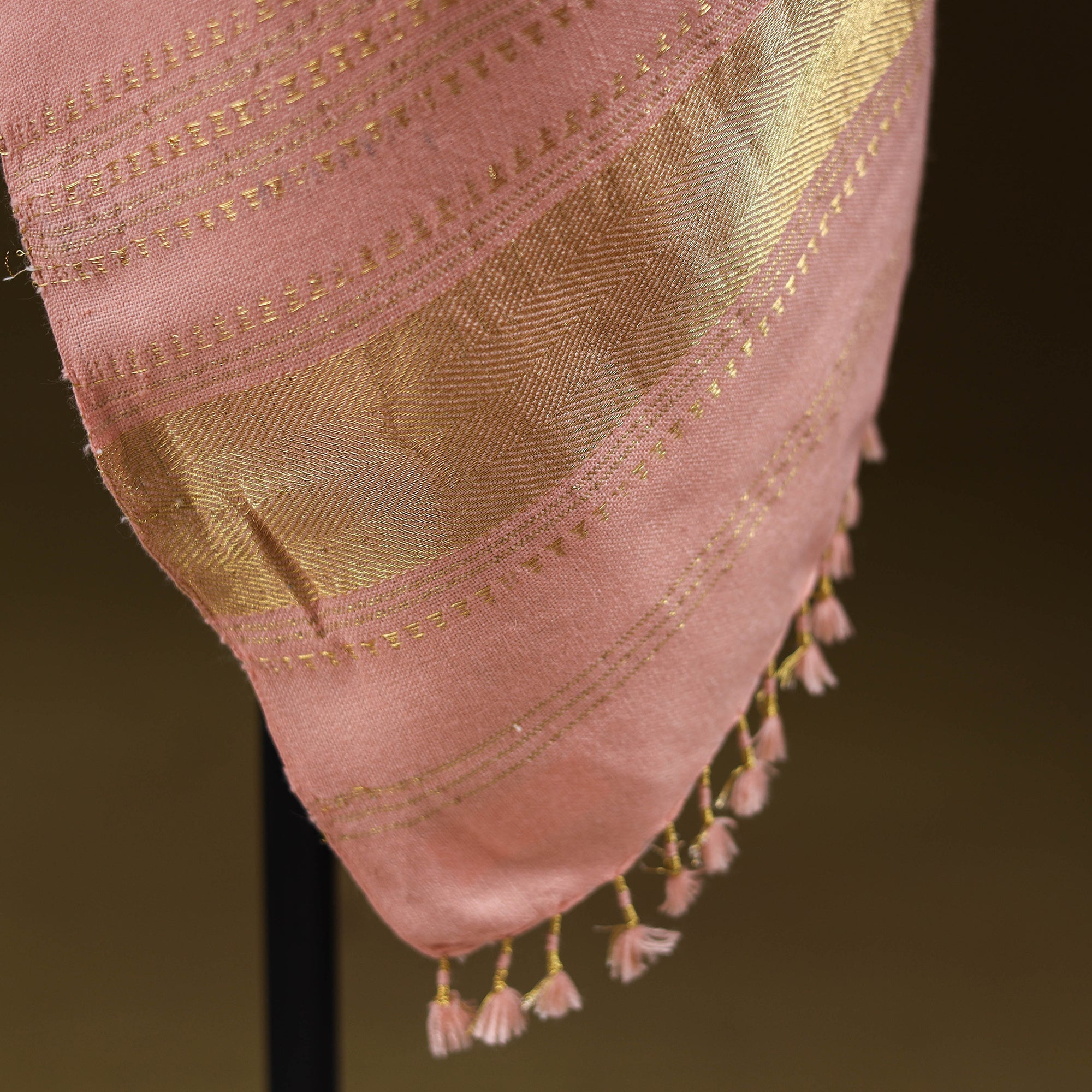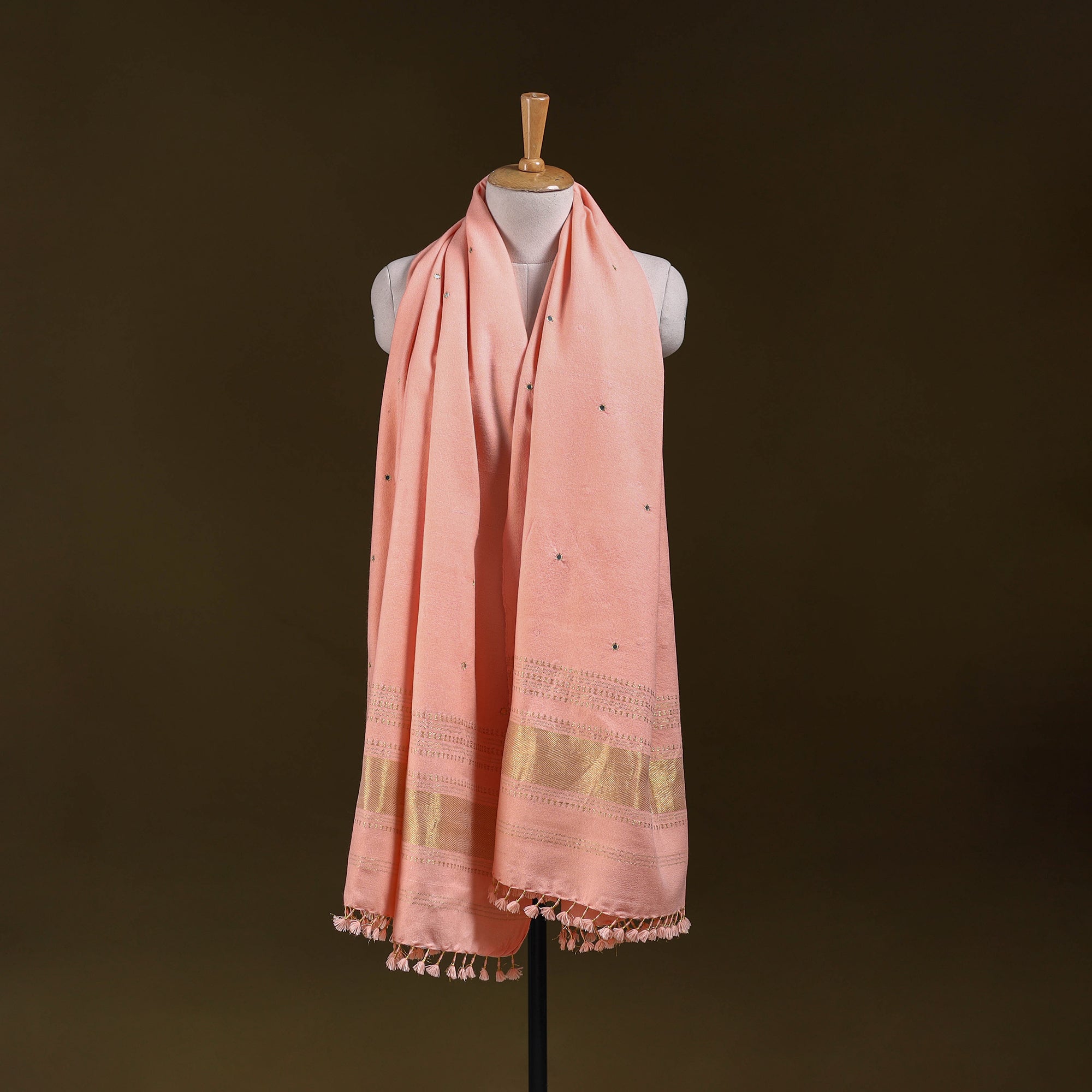 | Material | Pink kutch zari and mirror work handwoven shawl is created by skilled artisan Vankar Bhimji Kanji from Bhuj Gujarat. Adorned with traditional mirror and zari work along with intricate Kutchi motifs. Made from acrylic wool it offers both warmth and comfort. A perfect blend of tradition and style ideal for everyday elegance or festive wear. |