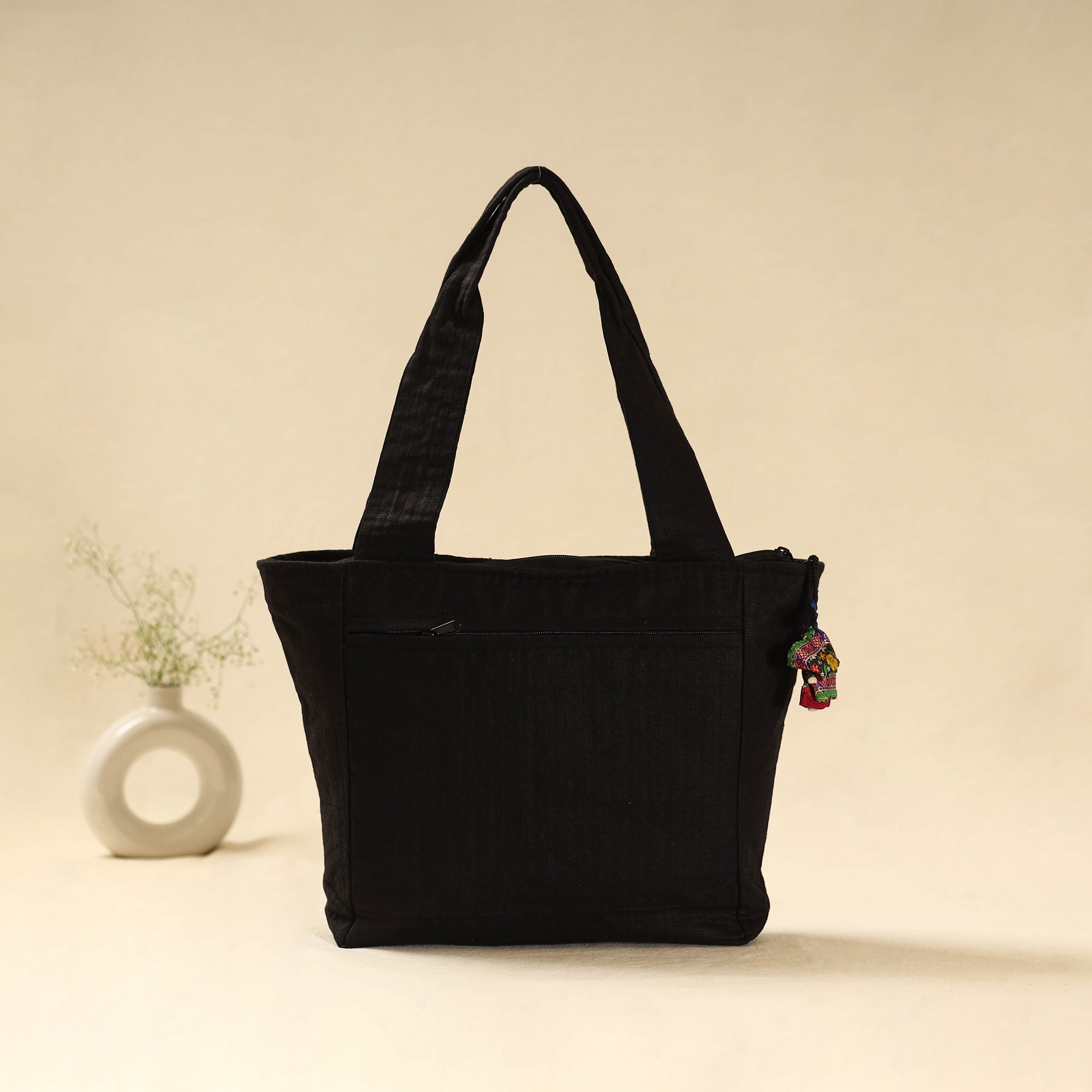 This black kutch jat hand-embroidered tote bag showcases the beautiful work of the Jat-Daaneta community. It features geometric patterns with tight stitches on cotton fabric, highlighted by mirrors and radiating lines. The bag includes one large main compartment, two inner pockets one with a zipper and one open and an outer zipper pocket for easy access.