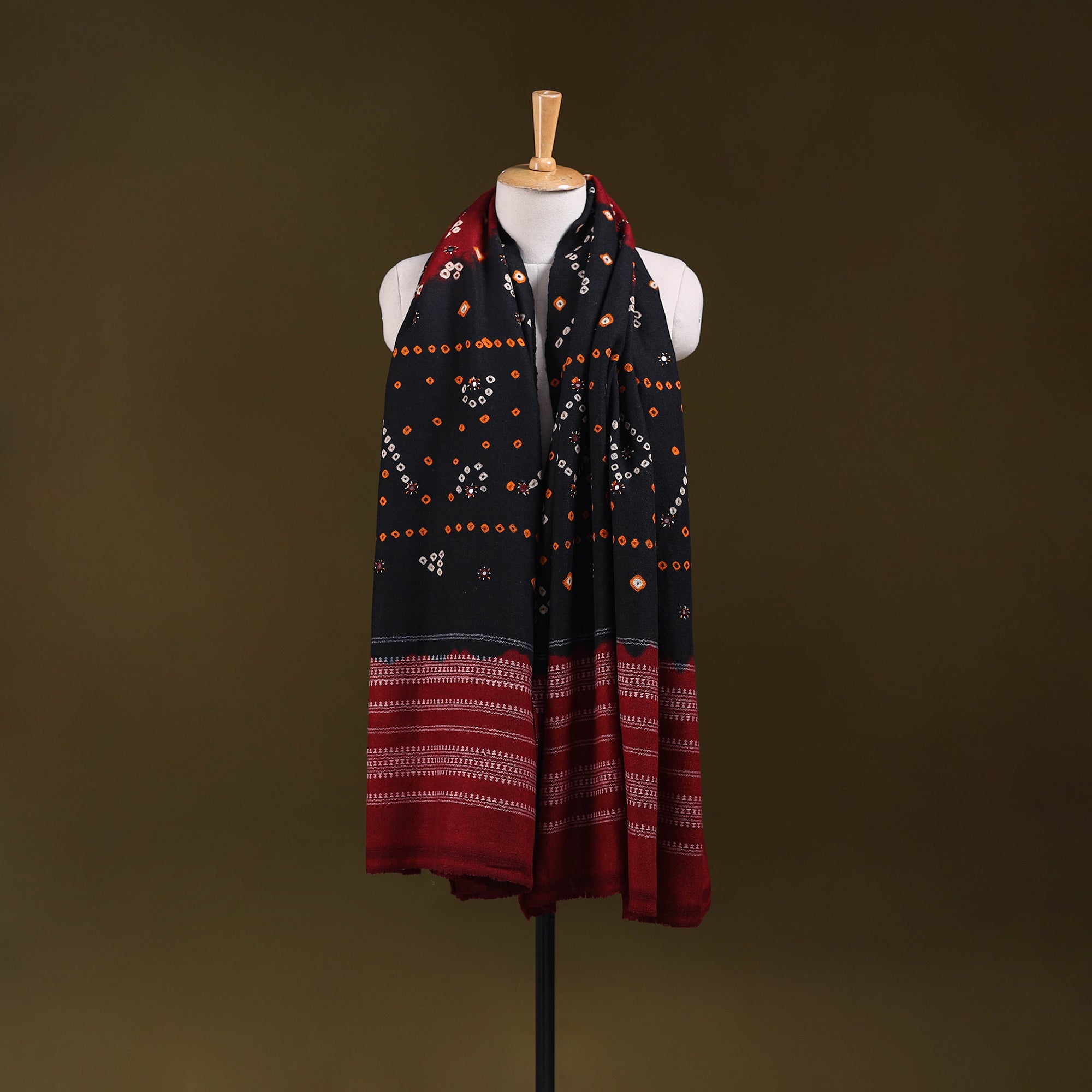 Handwoven bandhani tie-dye bagida merino wool mirror work shawl showcasing the artistry of Kutch Gujarat. Crafted by skilled artisan Vankar Bhimji Kanji it blends traditional charm with a contemporary touch. It adds grace to both everyday outfits and festive looks while offering comforting warmth making it a beautiful choice for chilly days.