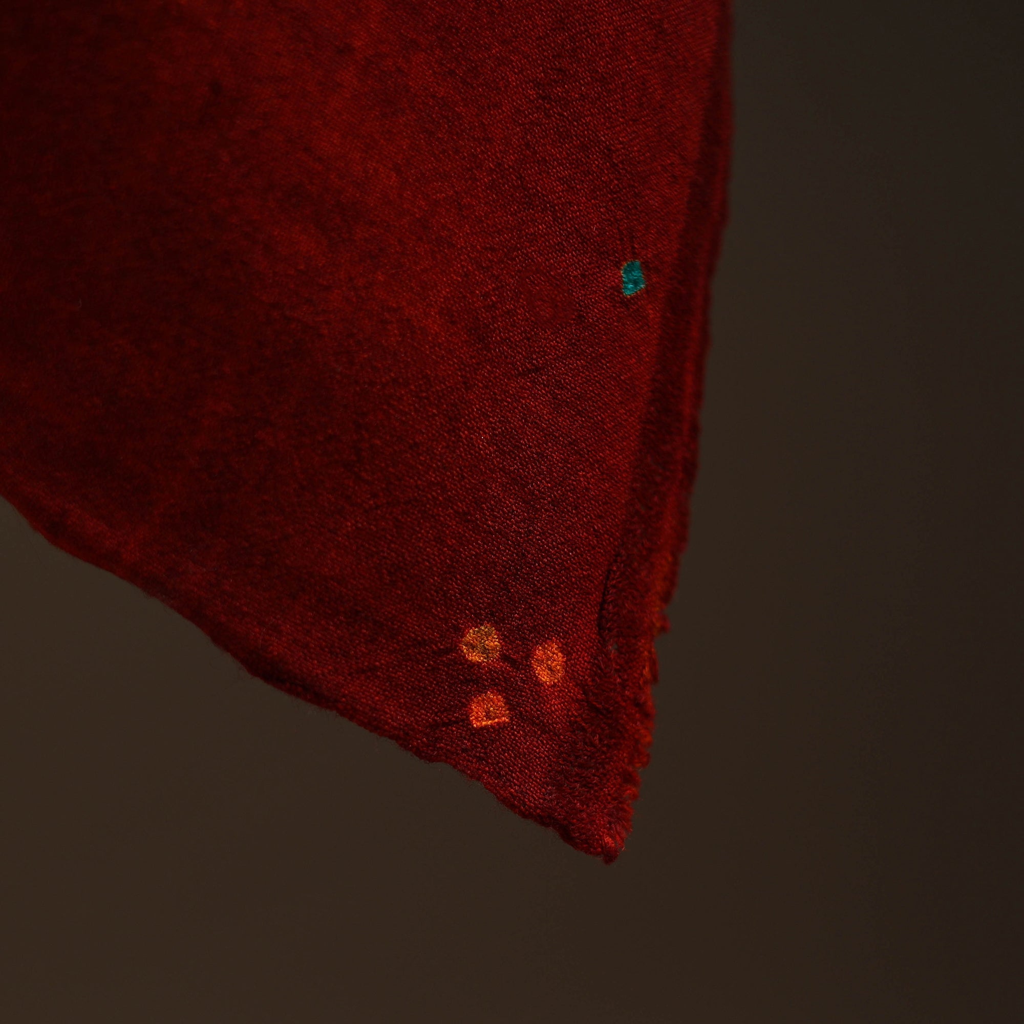 | Material | Red handwoven bandhani tie-dye hand embroidery bagida woolen shawl features intricate mirror work and carries the artistry of Kutch, Gujarat. Crafted by skilled artisans under the renowned Vankar Bhimji Kanji, it blends traditional charm with a contemporary feel. It adds a graceful touch to your everyday look or festive ensemble and also offers comforting warmth, making it a lovely choice for chilly days. Note : This piece carries tiny knots, thread pulls or uneven lines not flaws but fingerprints. Every irregularity is a whisper from the hands that made it. It’s what happens when tradition weaves through time, not machines. If you’re looking for perfection, this isn’t it. But if you’re looking for soul you’ve found it. |