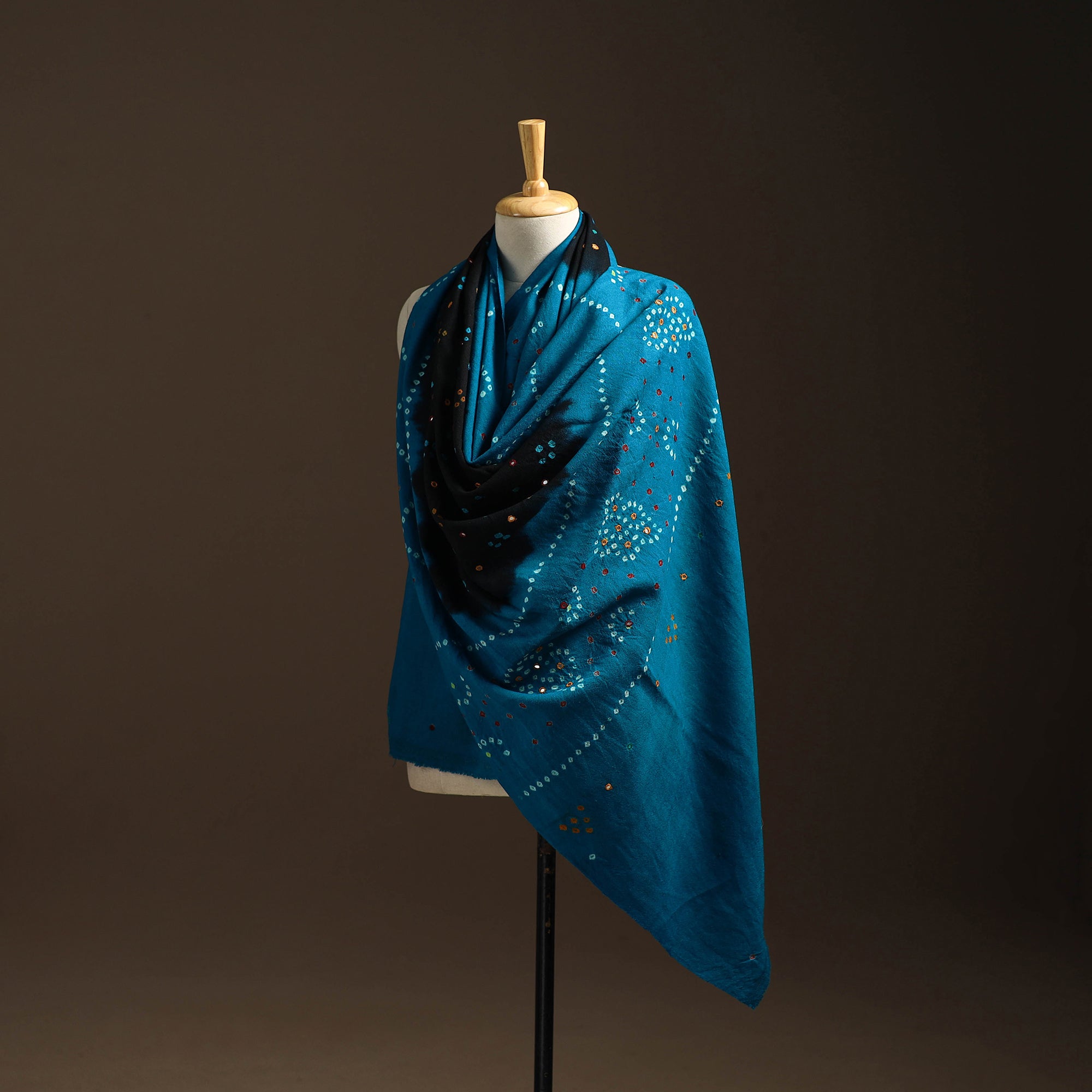 Blue handwoven bandhani tie-dye hand embroidery bagida woolen shawl features intricate mirror work and carries the artistry of Kutch, Gujarat. Crafted by skilled artisans under the renowned Vankar Bhimji Kanji, it blends traditional charm with a contemporary feel. It adds a graceful touch to your everyday look or festive ensemble and also offers comforting warmth, making it a lovely choice for chilly days.