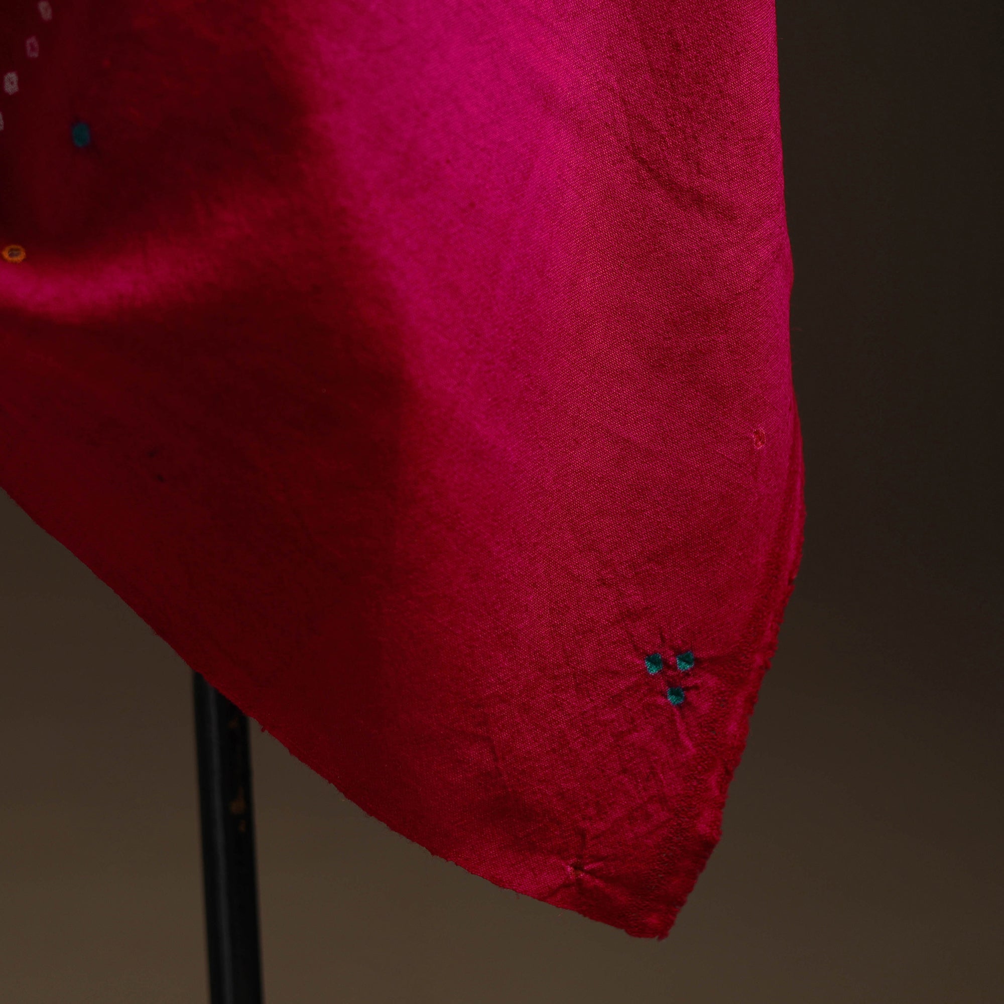 Pink handwoven bandhani tie-dye hand embroidery bagida woolen shawl features intricate mirror work and carries the artistry of Kutch, Gujarat. Crafted by skilled artisans under the renowned Vankar Bhimji Kanji, it blends traditional charm with a contemporary feel. It adds a graceful touch to your everyday look or festive ensemble and also offers comforting warmth, making it a lovely choice for chilly days.