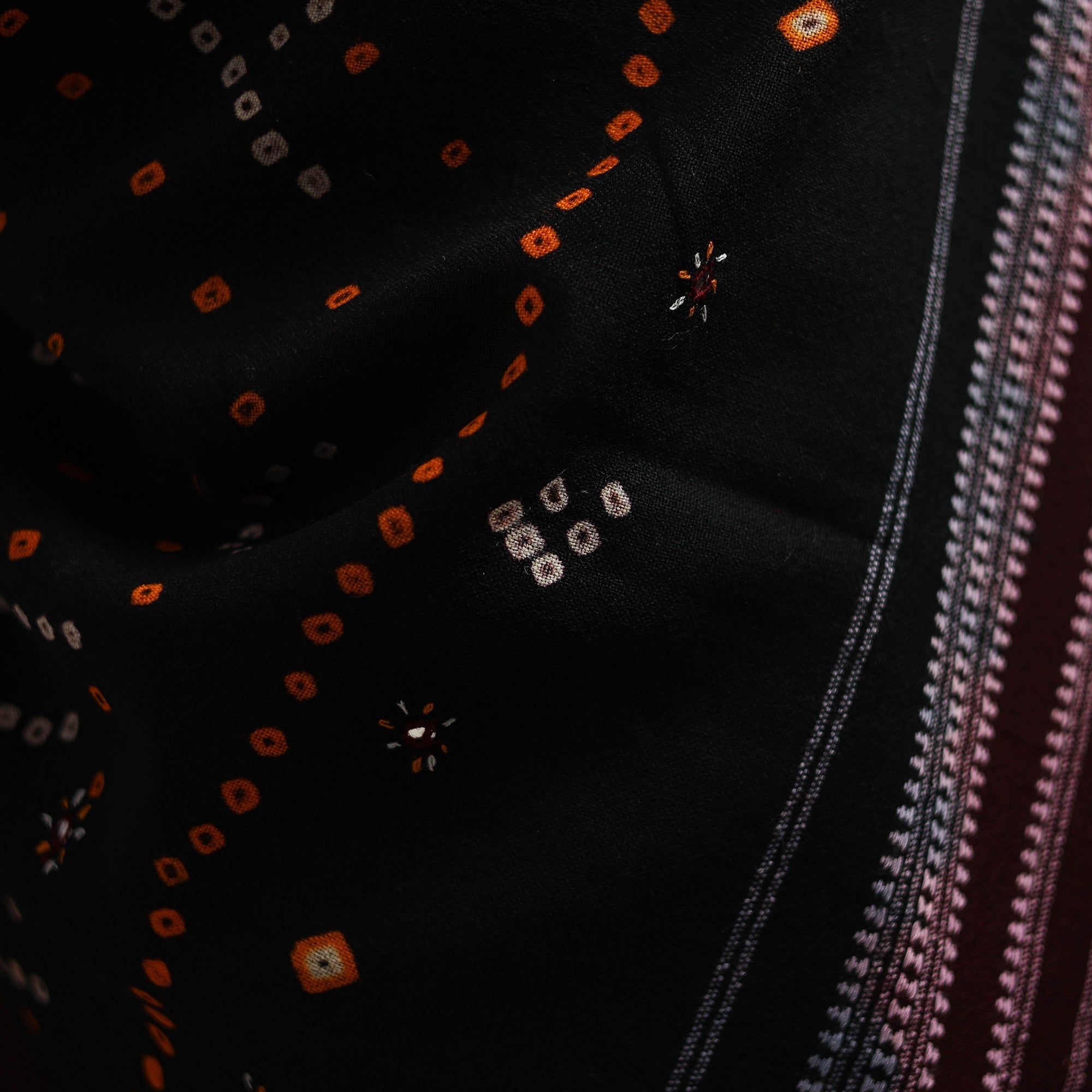 Black handwoven bandhani tie-dye hand embroidery bagida woolen shawl features intricate mirror work and carries the artistry of Kutch, Gujarat. Crafted by skilled artisans under the renowned Vankar Bhimji Kanji, it blends traditional charm with a contemporary feel. It adds a graceful touch to your everyday look or festive ensemble and also offers comforting warmth, making it a lovely choice for chilly days.