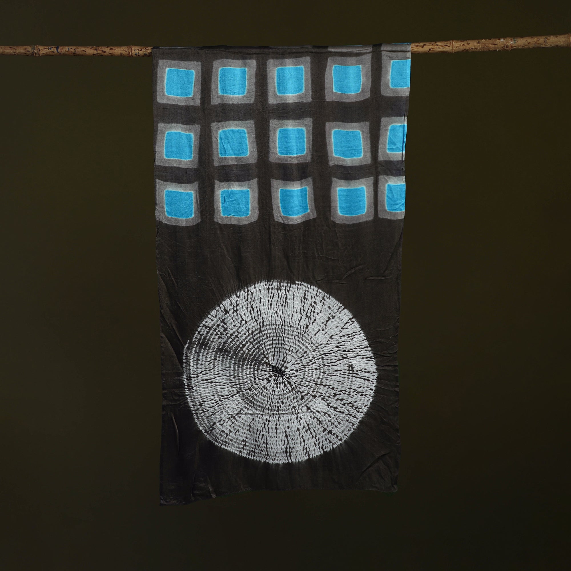 Traditional kutch shibori modal silk stole is dyed using the clamp method, where the fabric is folded into geometric shapes like squares or triangles and secured tightly between wooden blocks before dyeing. The clamped areas resist the dye, resulting in distinct and unique patterns. This stole is made by kutch artisan Khatri Faiz Abdul Gafur. Made from modal silk, the stole has a smooth surface and a graceful drape. Shibori is a resist-dye technique practiced for thousands of years. Lightweight and versatile, this stole pairs beautifully with both ethnic and contemporary outfits.