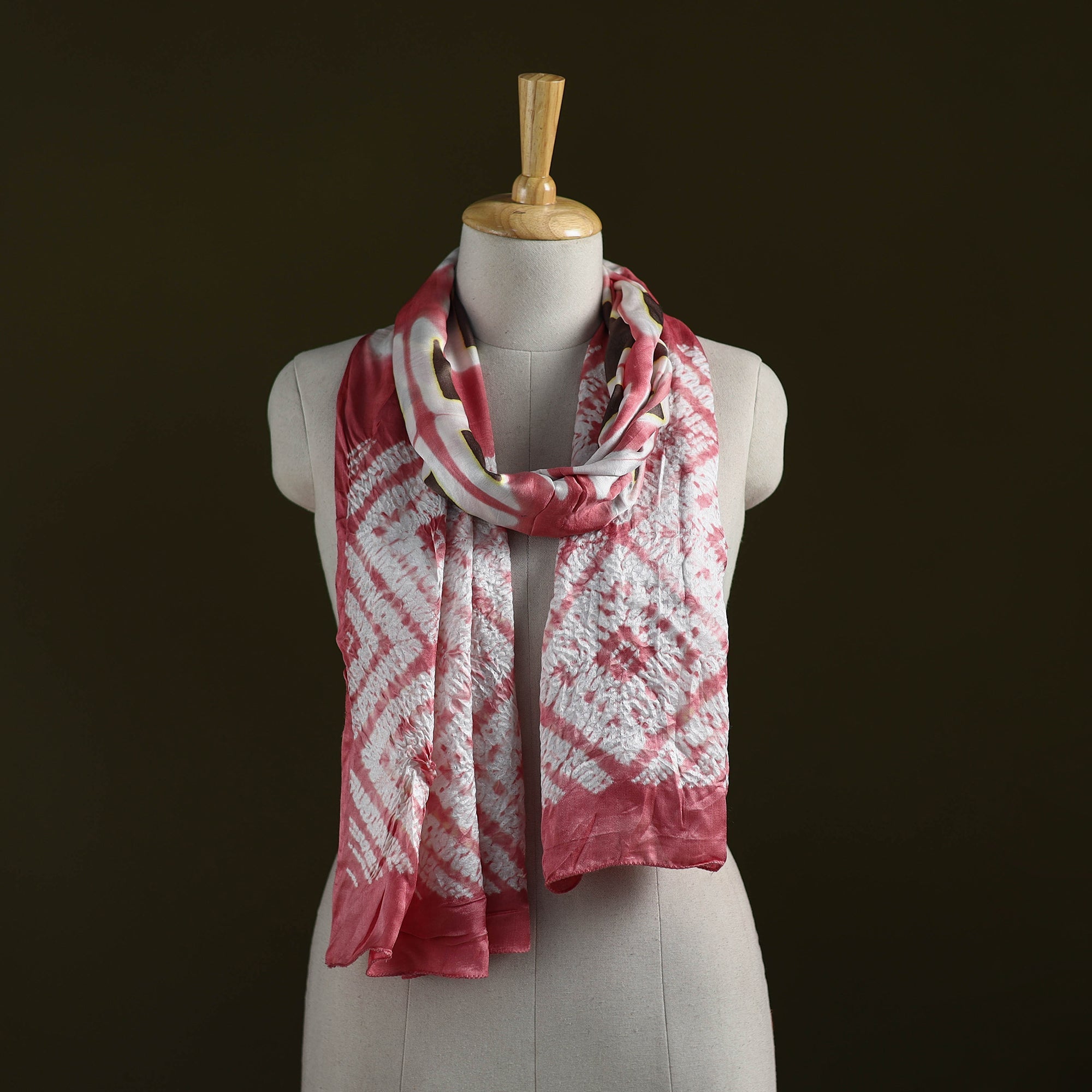 | Material | Traditional red kutch shibori modal silk stole is dyed using the clamp method, where the fabric is folded into geometric shapes like squares or triangles and secured tightly between wooden blocks before dyeing. The clamped areas resist the dye, resulting in distinct and unique patterns. This stole is made by kutch artisan Khatri Faiz Abdul Gafur. Made from modal silk, the stole has a smooth surface and a graceful drape. Shibori is a resist-dye technique practiced for thousands of years. Lightweight and versatile, this stole pairs beautifully with both ethnic and contemporary outfits. |