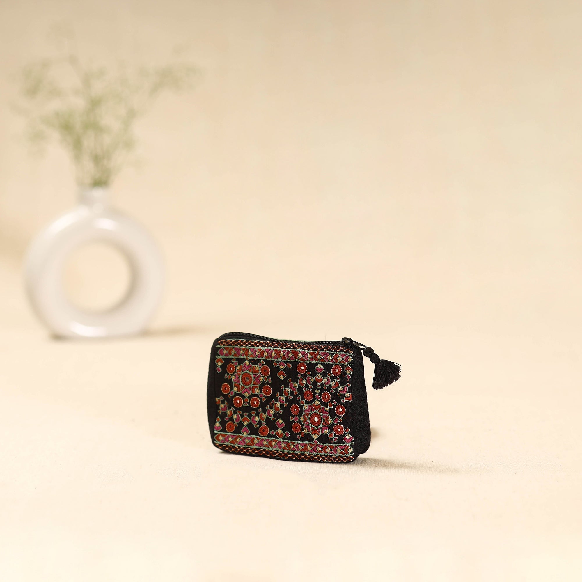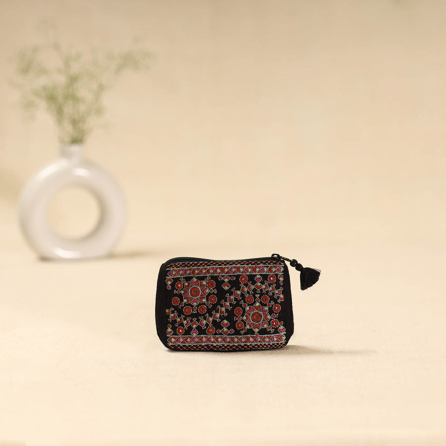 This black cotton coin pouch features neran hand embroidery from Kutch, known for its intricate eye-shaped motifs outlined in deep hues, filled with vibrant colours, and adorned with tiny mirrors. Crafted by the Sodha and Jadeja communities, it beautifully blends traditional artistry with modern design. Perfect for carrying coins, keys, or other small essentials.