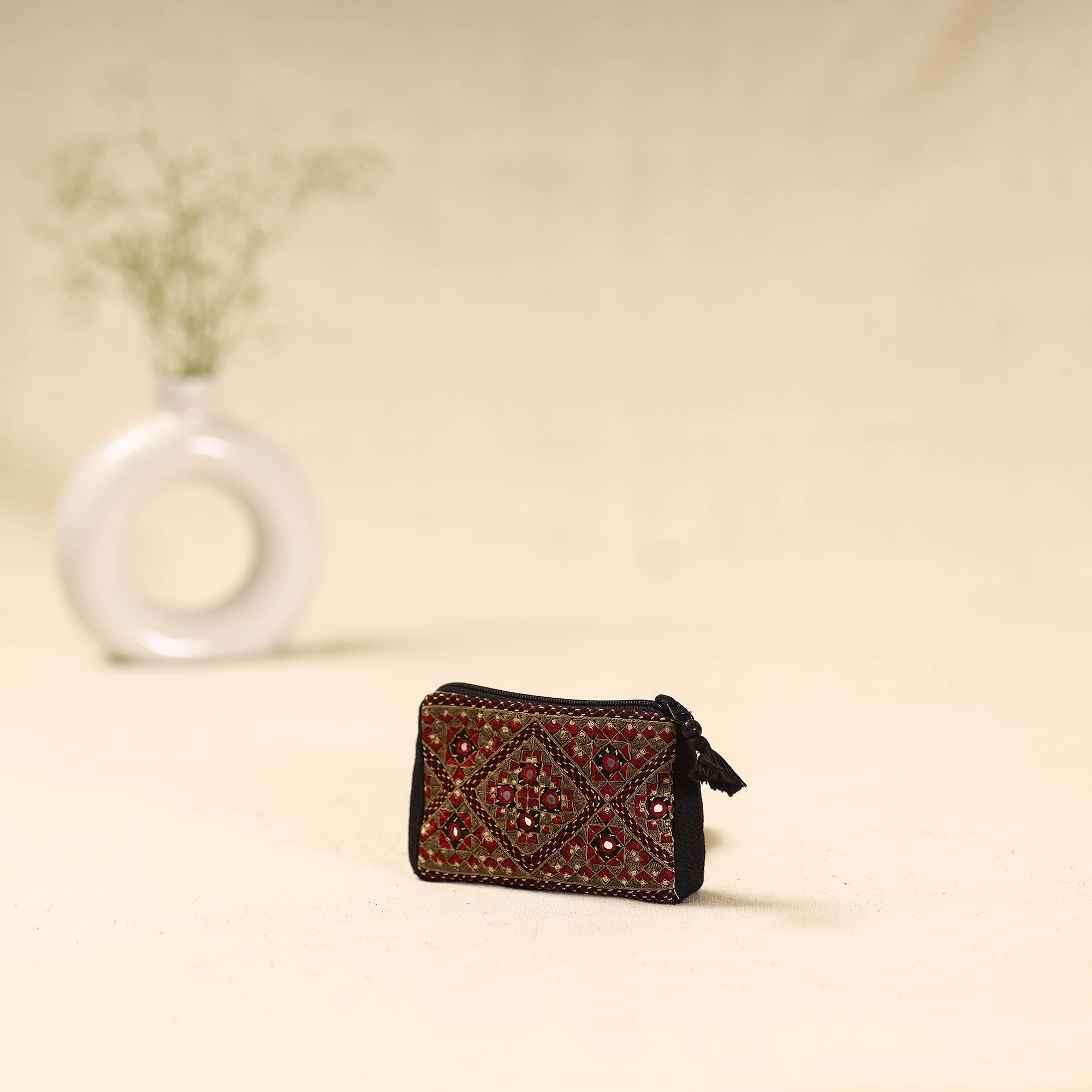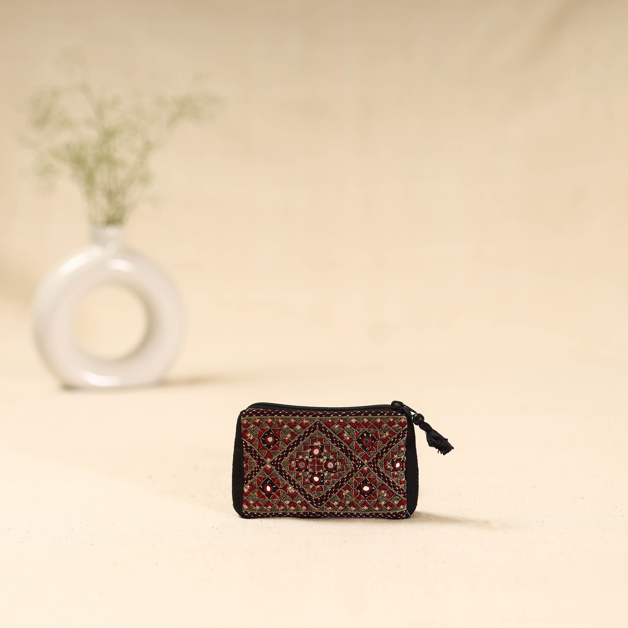 This black cotton coin pouch features neran hand embroidery from Kutch, known for its intricate eye-shaped motifs outlined in deep hues, filled with vibrant colours, and adorned with tiny mirrors. Crafted by the Sodha and Jadeja communities, it beautifully blends traditional artistry with modern design. Perfect for carrying coins, keys, or other small essentials.