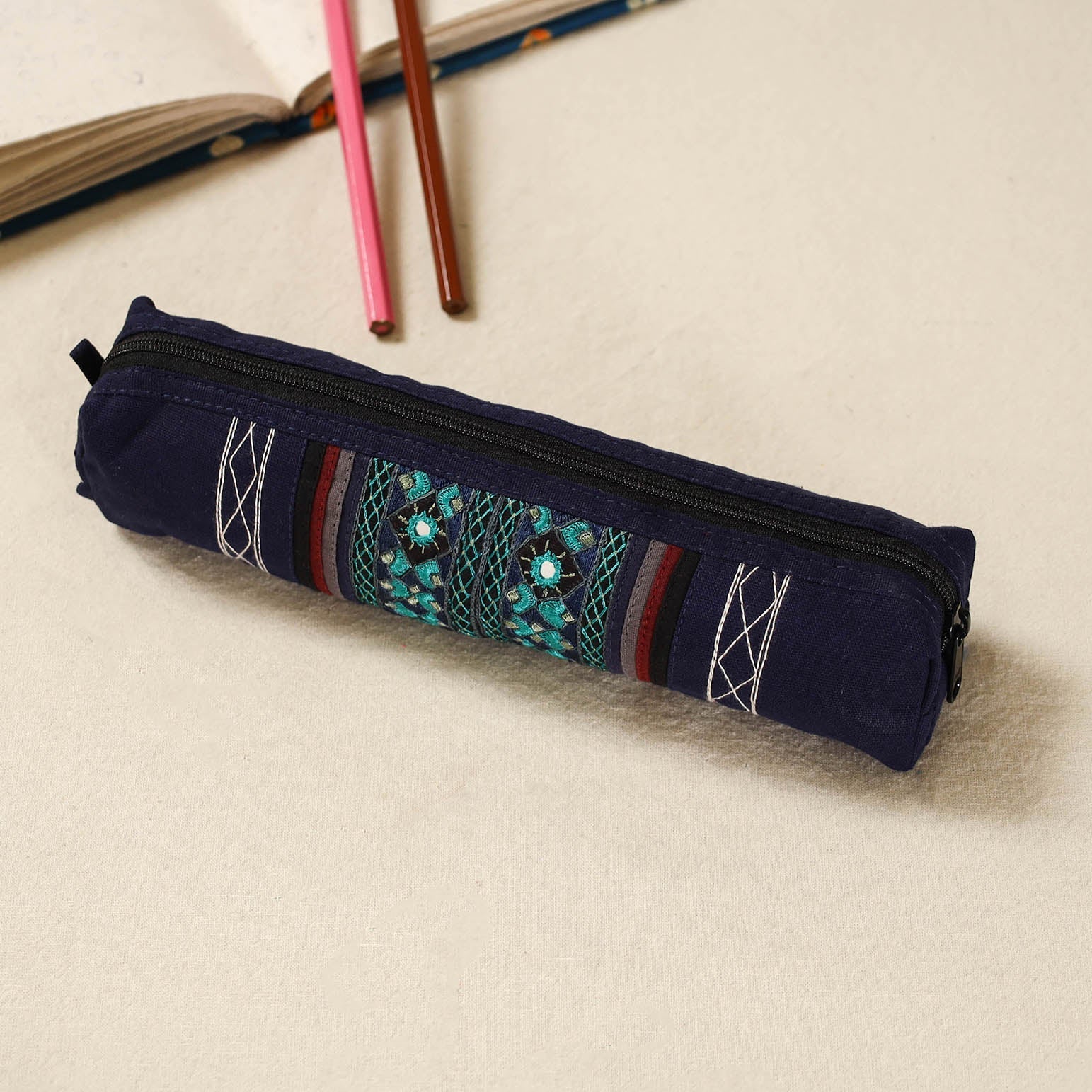 This blue cotton pencil pouch features neran hand embroidery from Kutch, known for its intricate eye-shaped motifs outlined in deep hues, filled with vibrant colours, and adorned with tiny mirrors. Crafted by the Sodha and Jadeja communities, it beautifully blends traditional artistry with modern design. Perfect for storing pens, pencils, brushes, or other small stationery essentials.