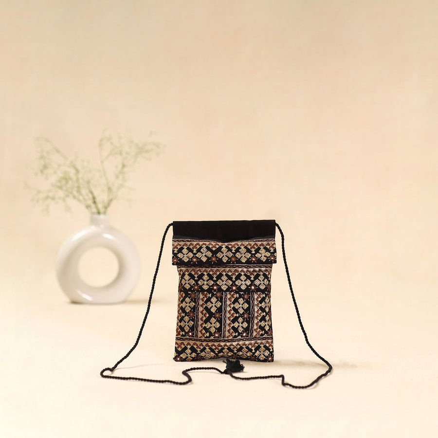 This black cotton sling bag features neran hand embroidery from Kutch, known for its intricate eye-shaped motifs outlined in deep hues, filled with vibrant colours, and adorned with tiny mirrors. Crafted by the Sodha and Jadeja communities, it beautifully blends traditional artistry with modern design. It includes three pockets, perfect for carrying your phone, and other daily essentials.