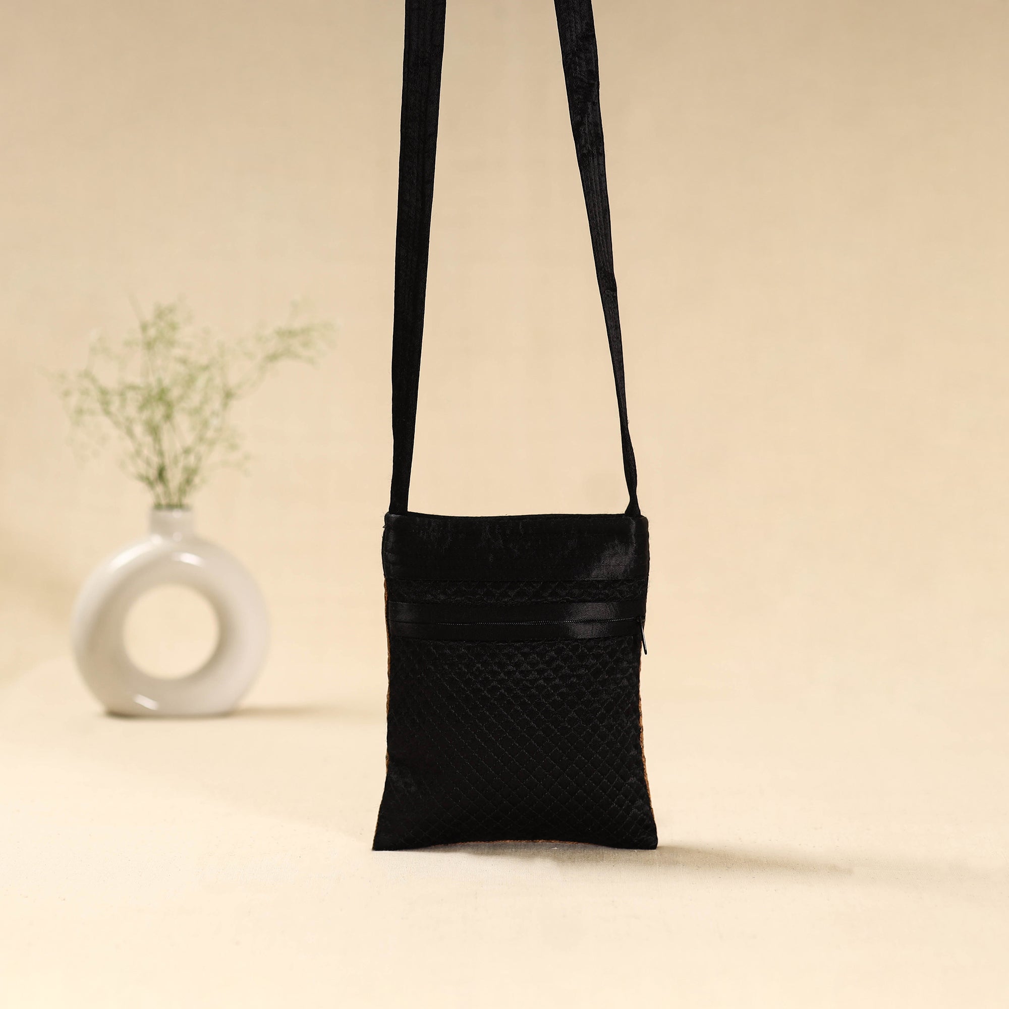 This black mashru silk sling bag features neran hand embroidery from Kutch, known for its intricate eye-shaped motifs outlined in deep hues, filled with vibrant colours and adorned with tiny mirrors. Crafted by the Sodha and Jadeja communities, it beautifully blends traditional artistry with modern design. Includes an inner zipper pocket for essentials and an outer zipper pocket for easy access.