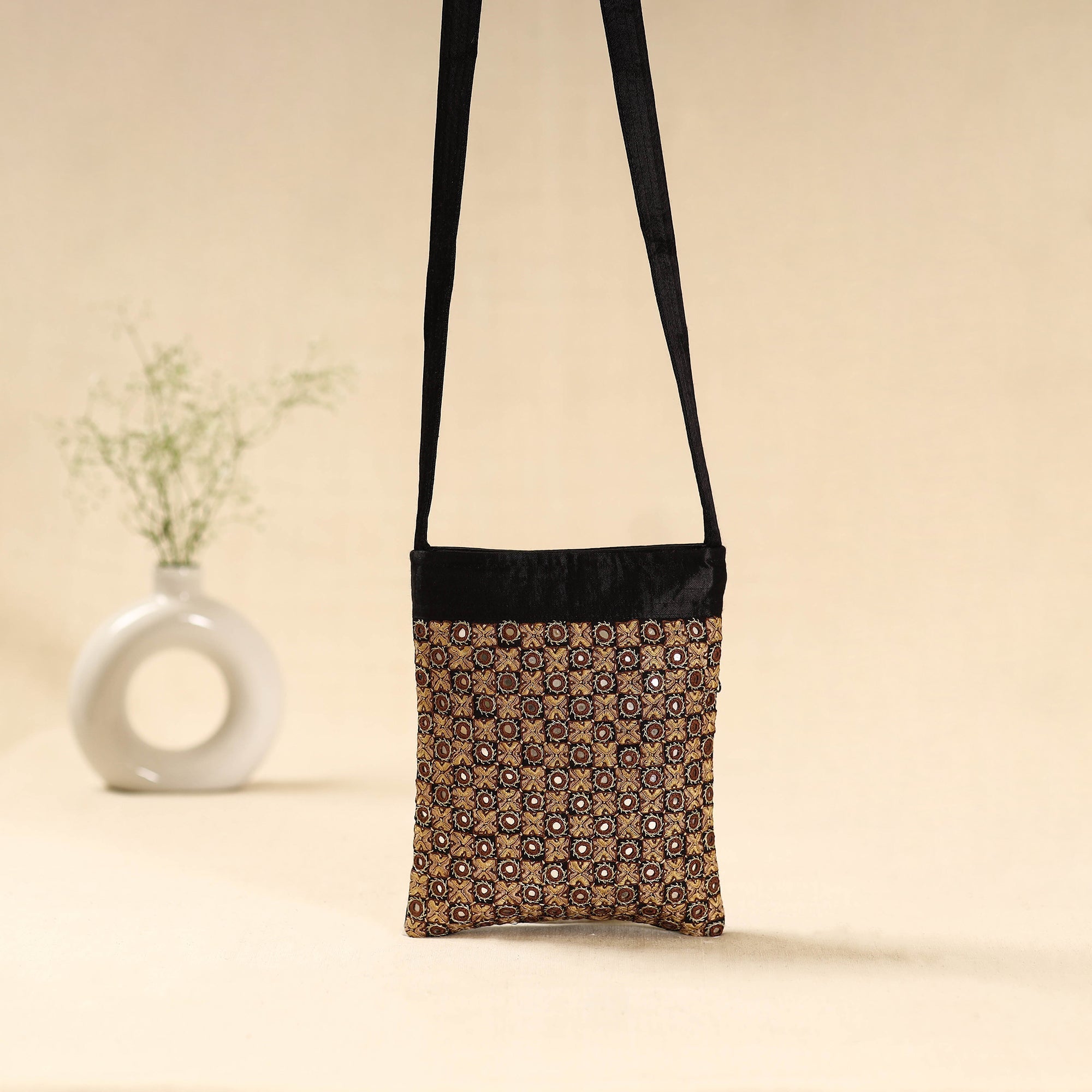 This black mashru silk sling bag features neran hand embroidery from Kutch, known for its intricate eye-shaped motifs outlined in deep hues, filled with vibrant colours and adorned with tiny mirrors. Crafted by the Sodha and Jadeja communities, it beautifully blends traditional artistry with modern design. Includes an inner zipper pocket for essentials and an outer zipper pocket for easy access.