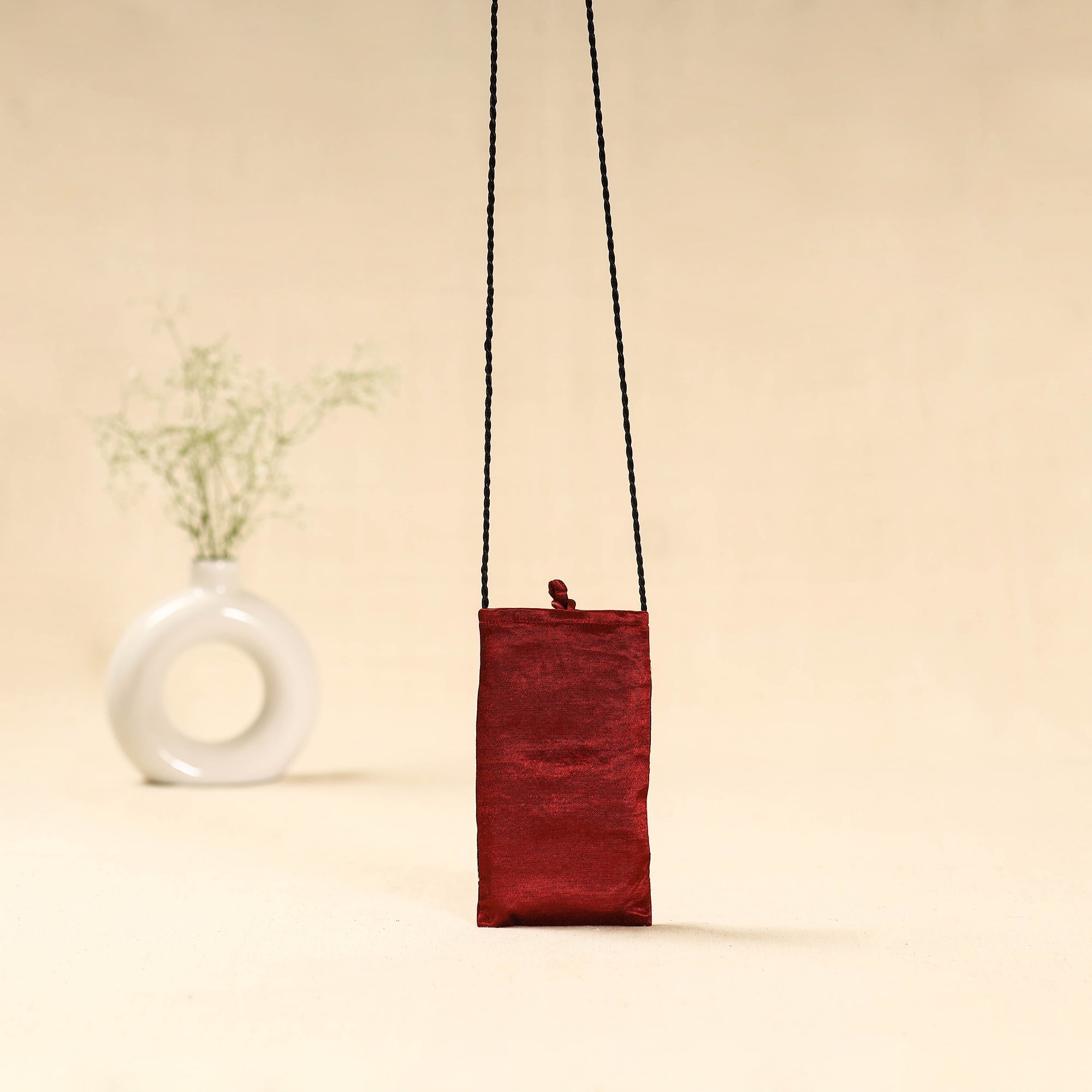 This red mashru silk sling dori mobile pouch features neran hand embroidery from Kutch, known for its intricate eye-shaped motifs outlined in deep hues, filled with vibrant colours, and adorned with tiny mirrors. Crafted by the Sodha and Jadeja communities, it beautifully blends traditional artistry with modern design. Perfect for carrying your phone and small essentials with ease.