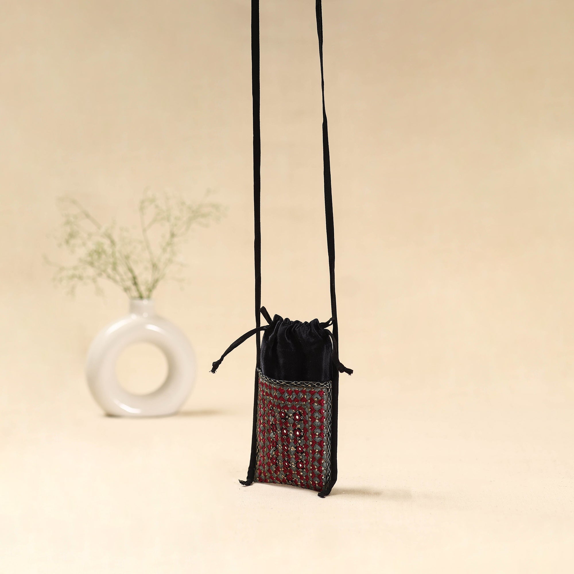 This black mashru silk sling dori mobile pouch features neran hand embroidery from Kutch, known for its intricate eye-shaped motifs outlined in deep hues, filled with vibrant colours, and adorned with tiny mirrors. Crafted by the Sodha and Jadeja communities, it beautifully blends traditional artistry with modern design. It includes side compartments, a central pocket, and a secure hand-pulling lock for convenience.