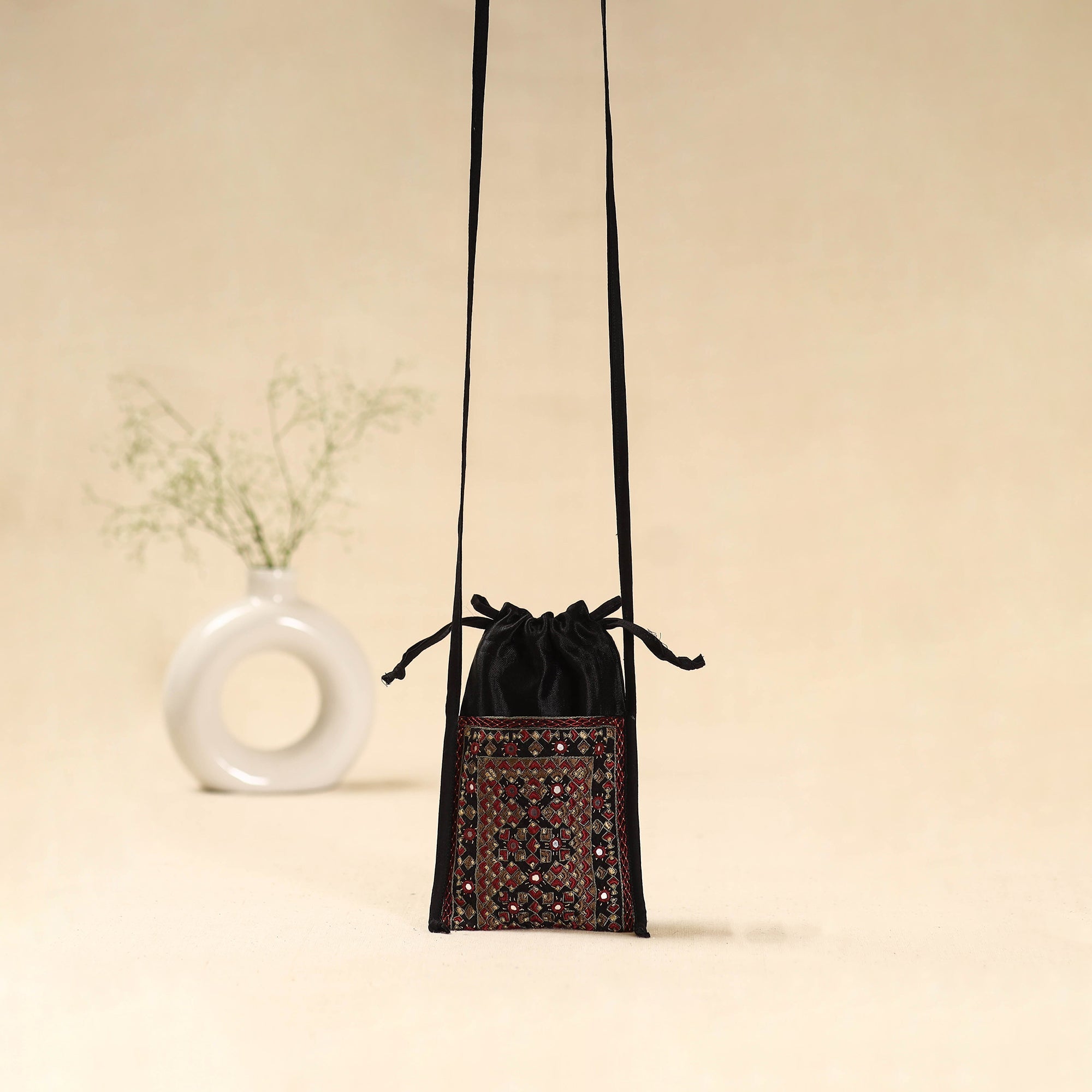 This black mashru silk sling dori mobile pouch features neran hand embroidery from Kutch, known for its intricate eye-shaped motifs outlined in deep hues, filled with vibrant colours, and adorned with tiny mirrors. Crafted by the Sodha and Jadeja communities, it beautifully blends traditional artistry with modern design. It includes side compartments, a central pocket, and a secure hand-pulling lock for convenience.