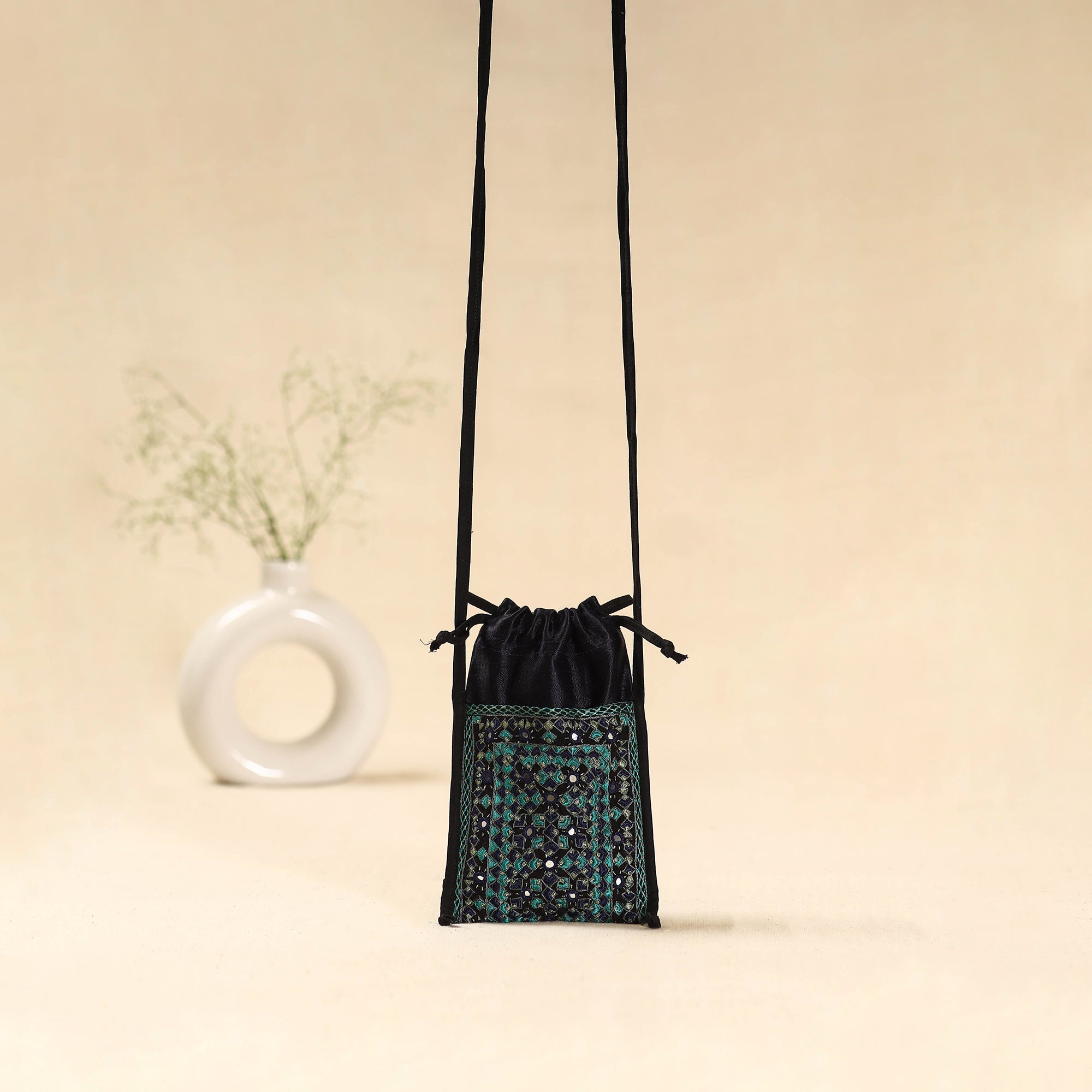 This black mashru silk sling dori mobile pouch features neran hand embroidery from Kutch, known for its intricate eye-shaped motifs outlined in deep hues, filled with vibrant colours, and adorned with tiny mirrors. Crafted by the Sodha and Jadeja communities, it beautifully blends traditional artistry with modern design. It includes side compartments, a central pocket, and a secure hand-pulling lock for convenience.