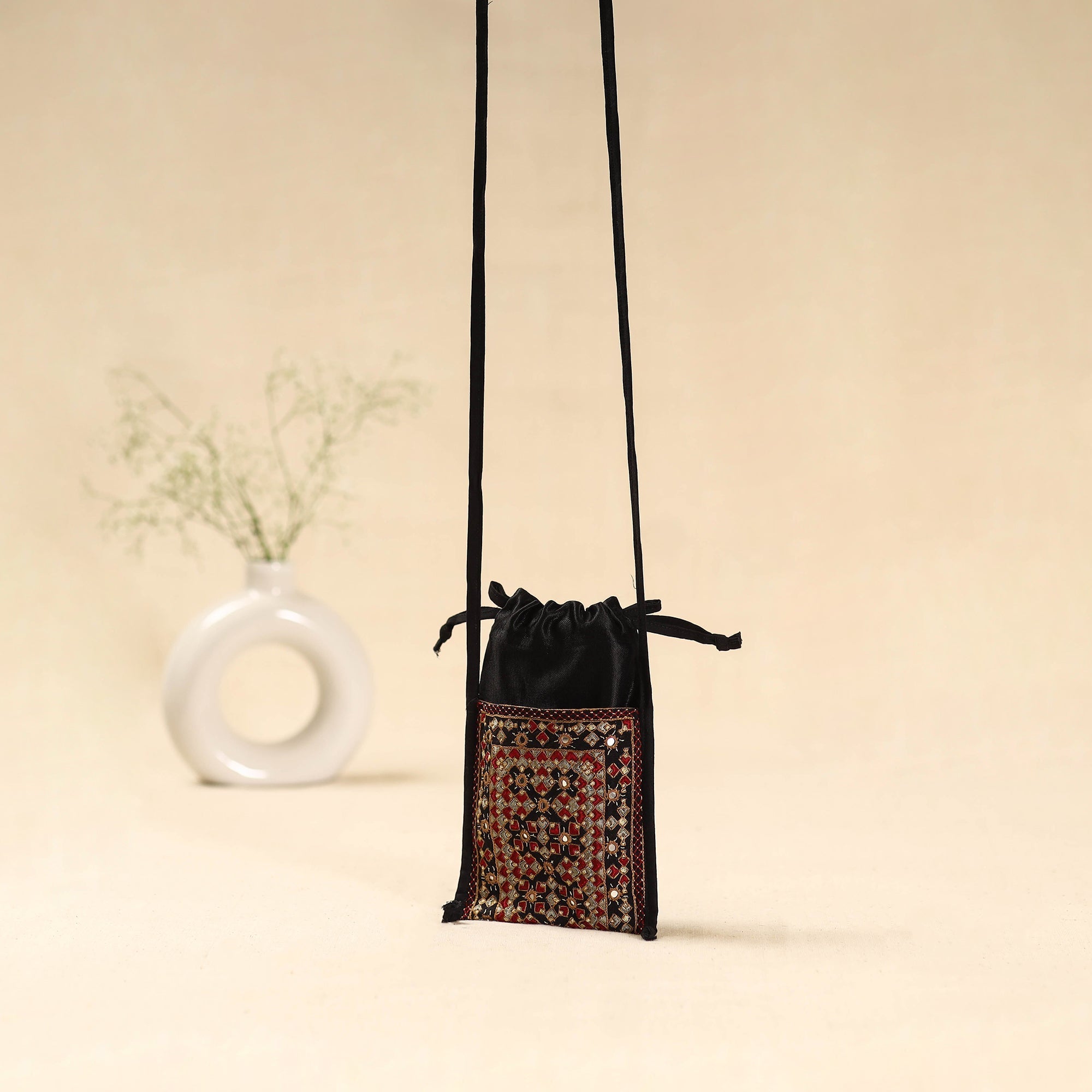 This black mashru silk sling dori mobile pouch features neran hand embroidery from Kutch, known for its intricate eye-shaped motifs outlined in deep hues, filled with vibrant colours, and adorned with tiny mirrors. Crafted by the Sodha and Jadeja communities, it beautifully blends traditional artistry with modern design. It includes side compartments, a central pocket, and a secure hand-pulling lock for convenience.