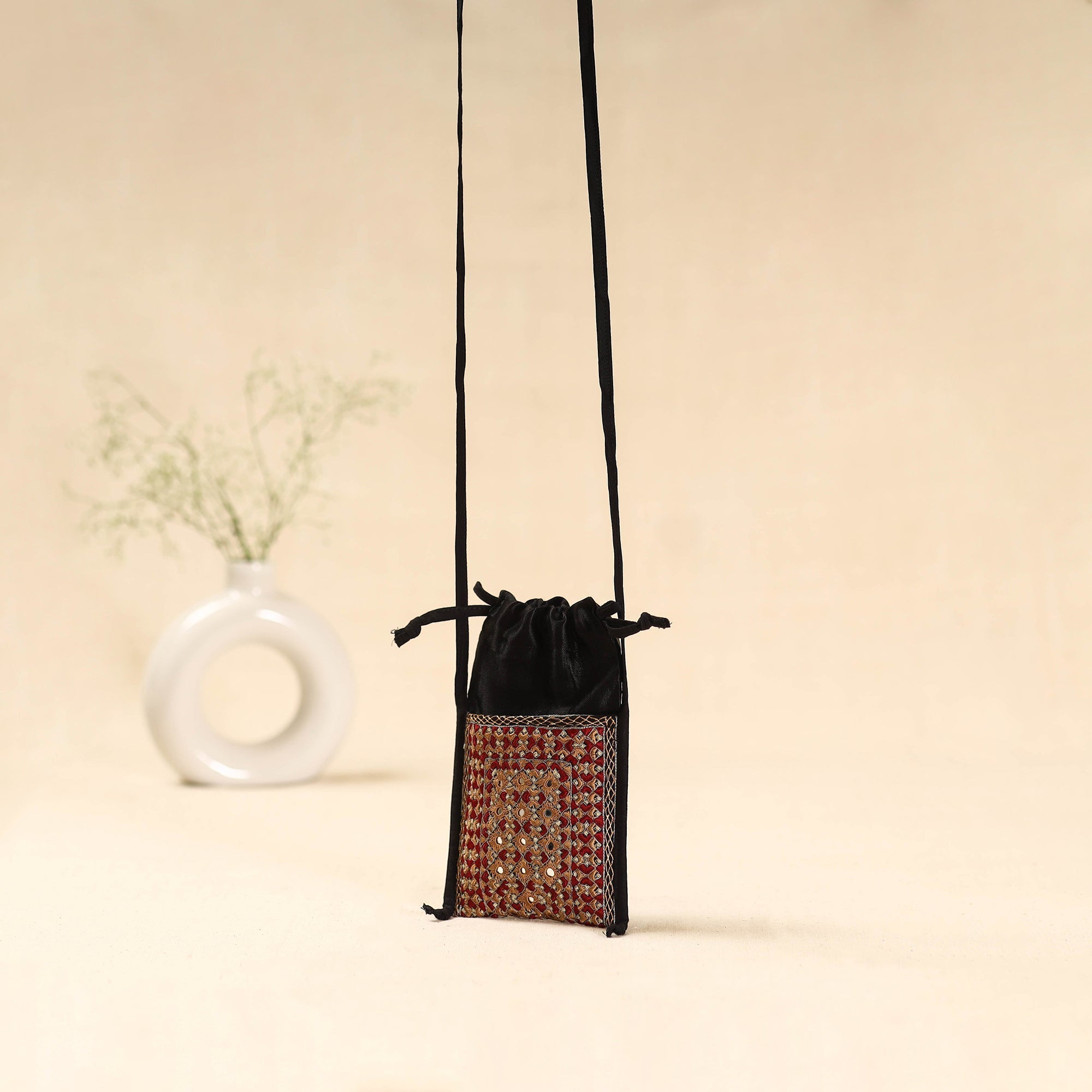 This black mashru silk sling dori mobile pouch features neran hand embroidery from Kutch, known for its intricate eye-shaped motifs outlined in deep hues, filled with vibrant colours, and adorned with tiny mirrors. Crafted by the Sodha and Jadeja communities, it beautifully blends traditional artistry with modern design. It includes side compartments, a central pocket, and a secure hand-pulling lock for convenience.