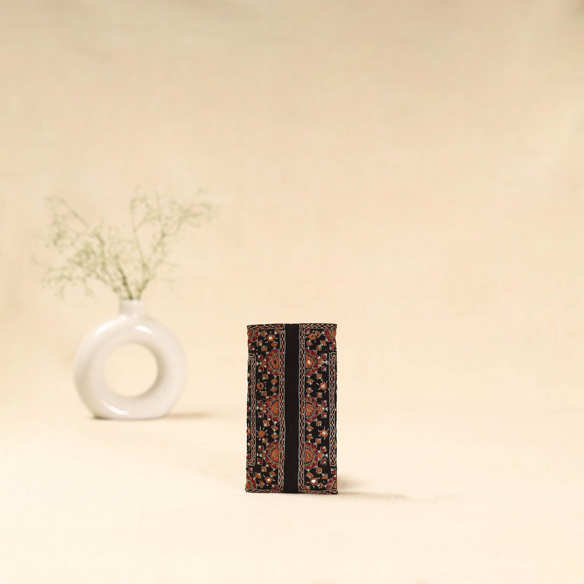 This black cotton spectacle pouch features neran hand embroidery from Kutch, known for its intricate eye-shaped motifs outlined in deep hues, filled with vibrant colours, and adorned with tiny mirrors. Crafted by the Sodha and Jadeja communities, it beautifully blends traditional artistry with modern design. Perfect for keeping your spectacles or sunglasses safe and scratch-free.