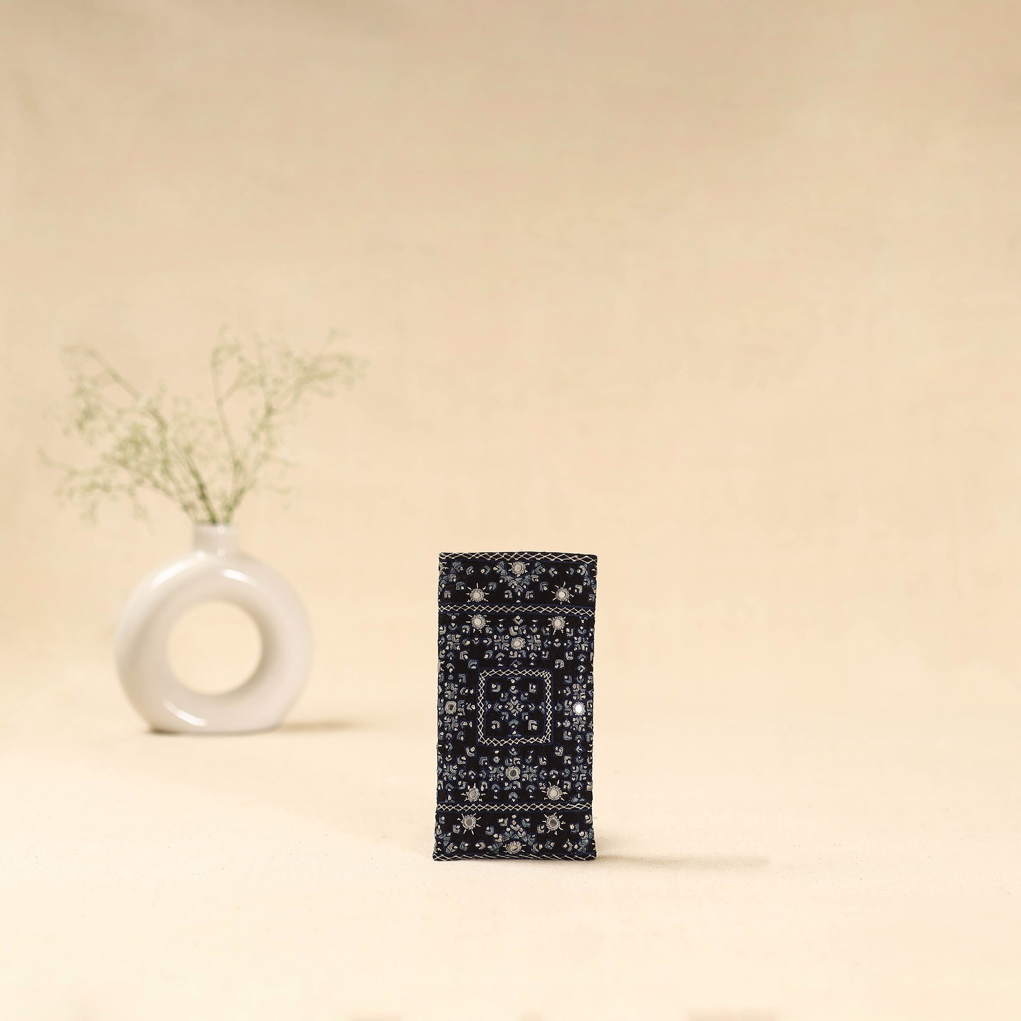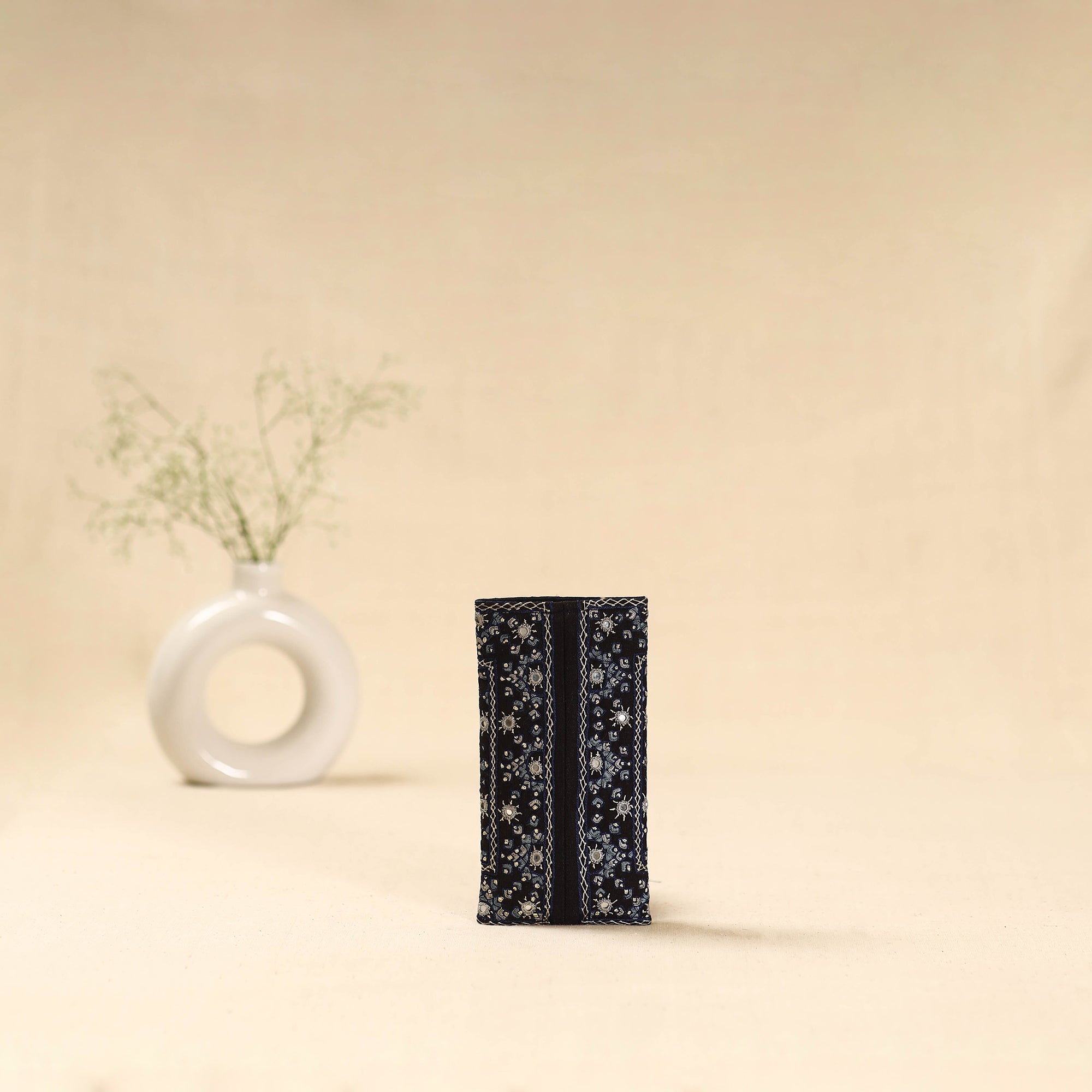 This black cotton spectacle pouch features neran hand embroidery from Kutch, known for its intricate eye-shaped motifs outlined in deep hues, filled with vibrant colours, and adorned with tiny mirrors. Crafted by the Sodha and Jadeja communities, it beautifully blends traditional artistry with modern design. Perfect for keeping your spectacles or sunglasses safe and scratch-free.